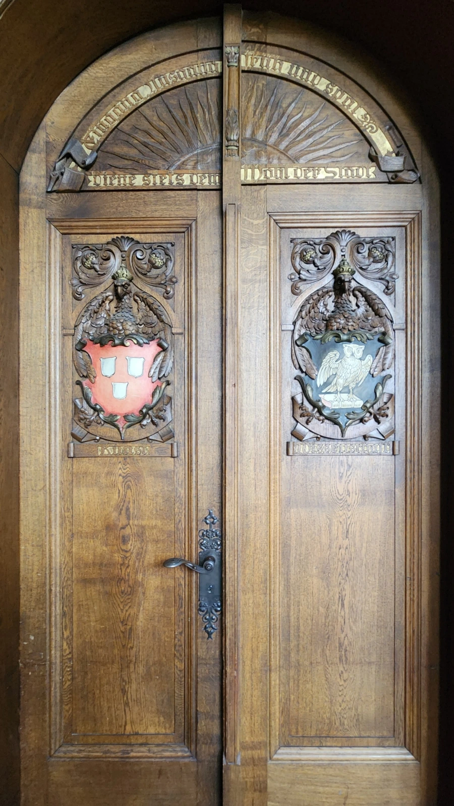 안내하시는 분은 (첫눈에도 내가 시의회홀을 찾아온 관광객처럼 보였는지) 아무런 말도 없이 나를 시청사 내의 시의회홀로 인도했다. 시의회홀로 들어가는 문인데, 벌써 문부터 예사롭지가 않다. 육중해 보이기도 하거니와, 나무조각이 예술이다.