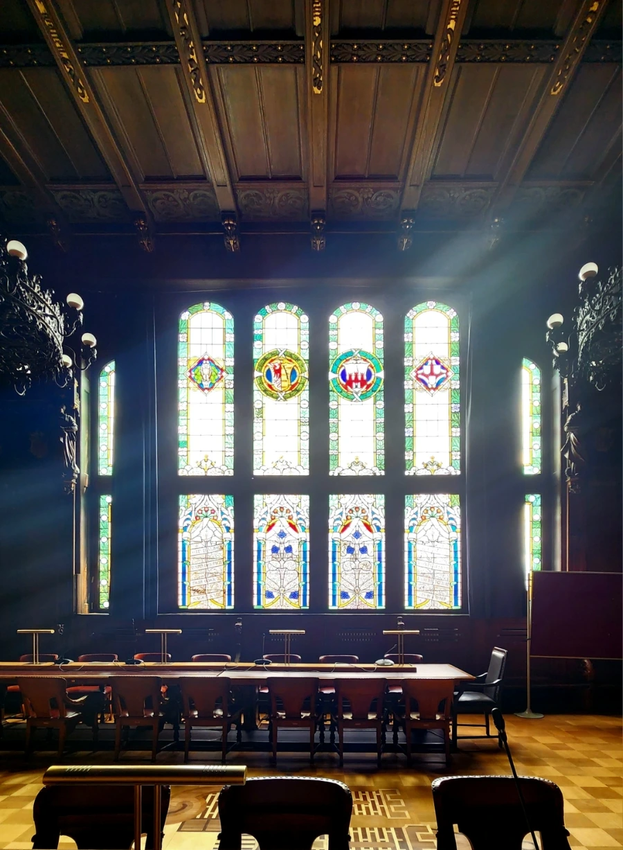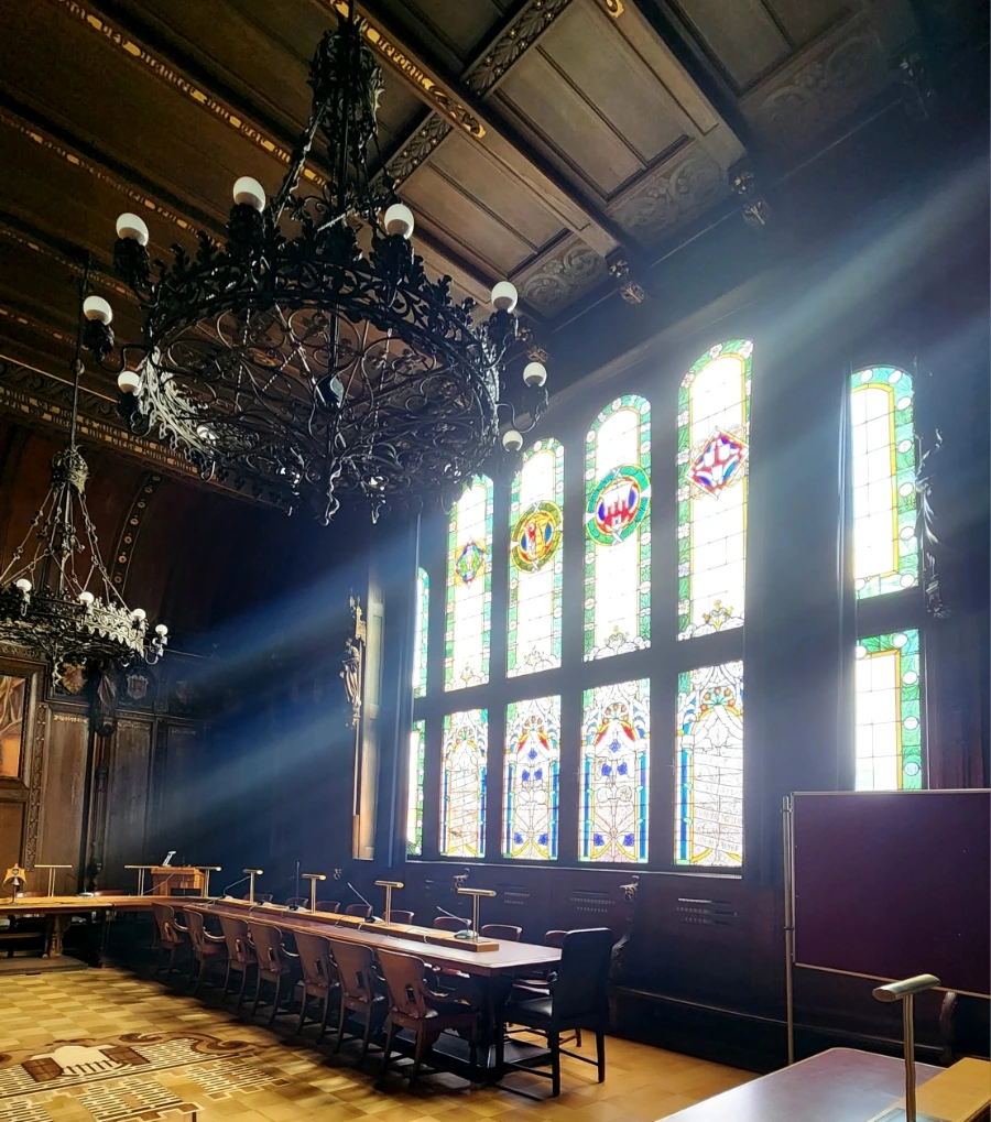 안내하시는 분의 뒤를 따라 시의회홀로 들어섰는데, 우선 햇빛을 날아다니게 만드는 유리창이 내 시선을 사로잡아 버렸다.