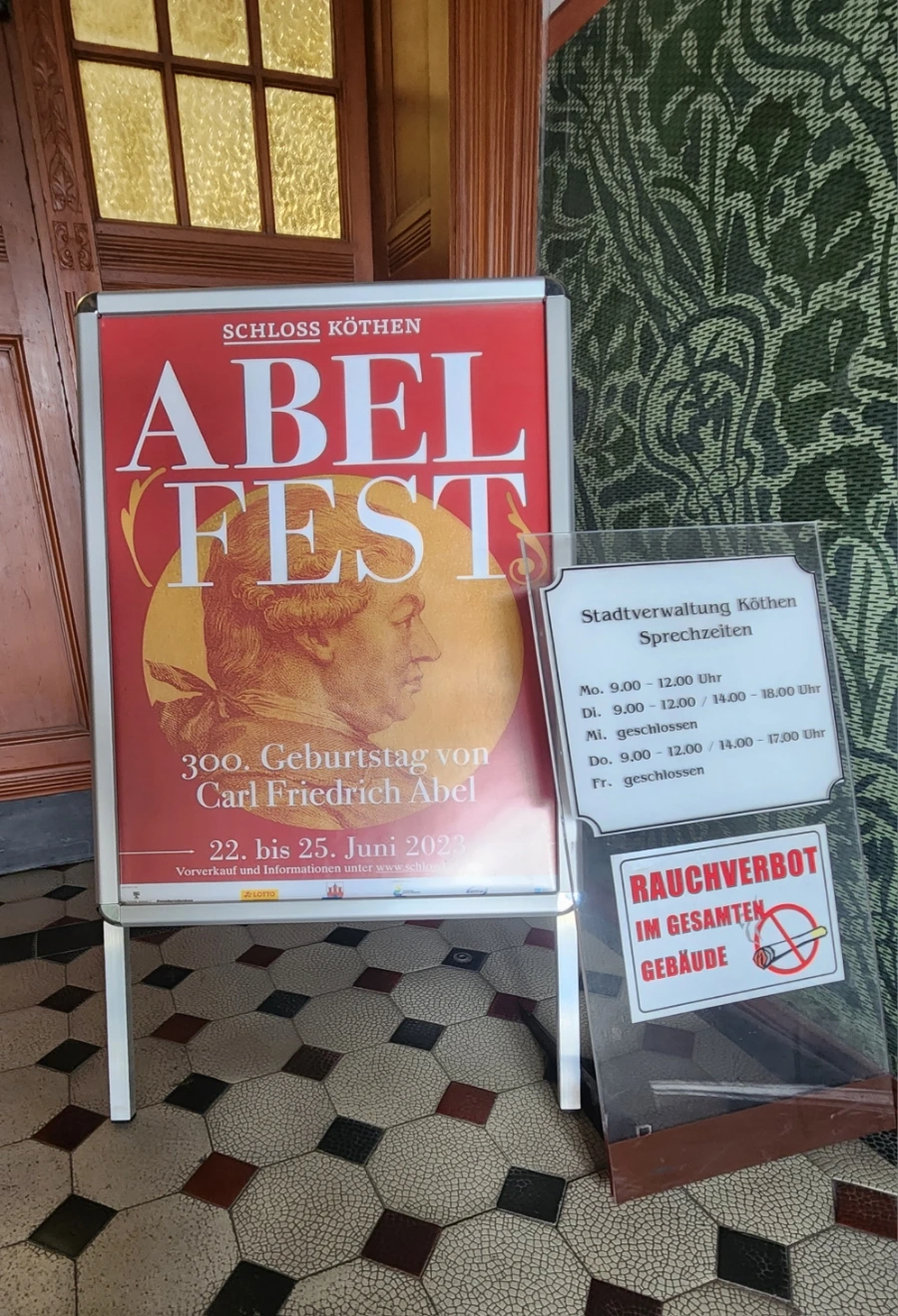 시청사 입구의 문을 열고 들어서니 쾨텐 출신의 작곡가이자 감바 연주자인 아벨(Carl Friedrich Abel, 1723~1787) 탄생 300주년을 기념하는 아벨 축제(ABEL FEST)가 쾨텐성(SCHOOSS KÖTHEN)에서 열리는 것을 알리는 입간판이 서있다. 이런, 내가 쾨텐을 찾기 이틀전이었네. 아, 감바(Gamba, 풀네임은 Viola Da Gamba)는 독일어로는 감베(Gambe)라고 쓰는데, 발로 받치고 연주하는 악기이다.