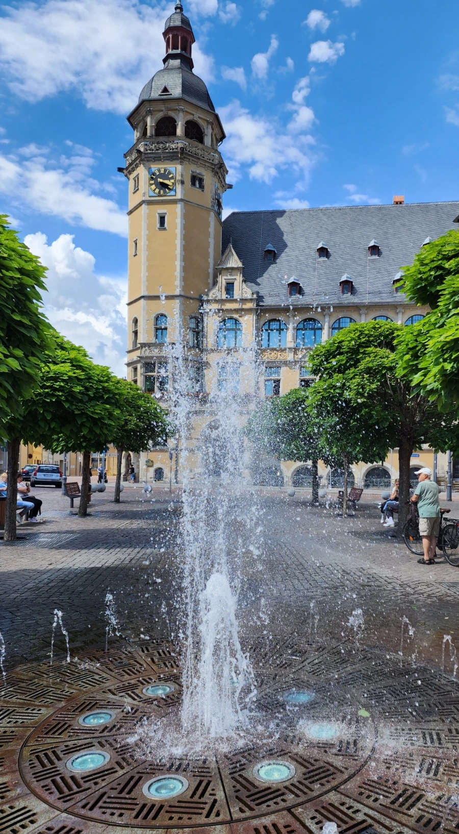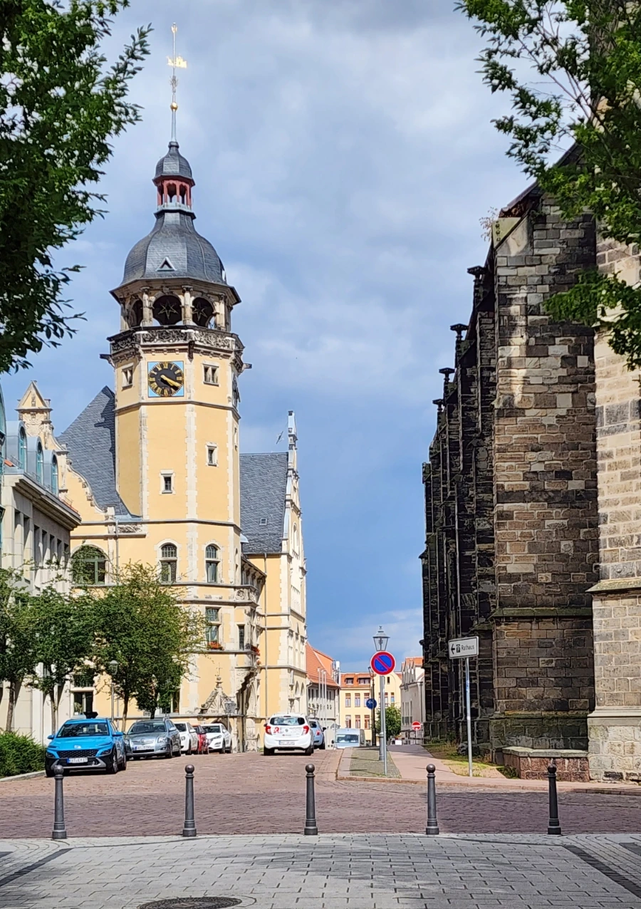 시청사쪽으로 조금 더 걸어가서 사진을 찍으니 건물 왼쪽에 있는 시계탑이 또렷하게 눈에 들어 오는데, 저래 보여도 시계탑의 높이는 40m에 이른다. 시청사의 시계탑에서 바라다보는 쾨텐 시가지의 뷰가 일품이라는데, 시의회홀에 정신이 팔려 당시에 저곳에 있을 때에는 탑에 오를 생각을 하지 못했다.
