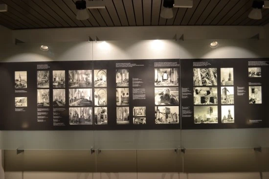 돌아 나오는 길. 폭격으로 교회가 붕괴되었을 때의 모습과 그 후의 복구과정을 소개하는 내용이 담긴 사진들이 전시되어 있다.