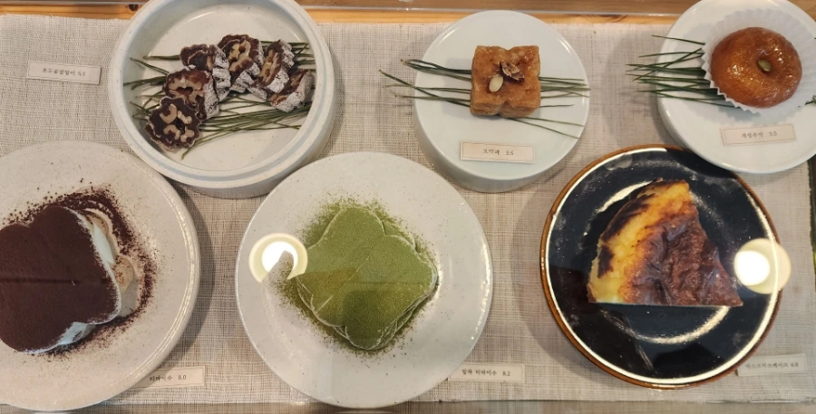 사실은 요렇게 생긴 "서하 다과상"을 주문하고 싶었다. 그러나 점심을 워낙 과하게 먹어 서하 다과상은 아무래도 부담스러울 듯해서 단품으로 호두곶감말이를 주문한 것.