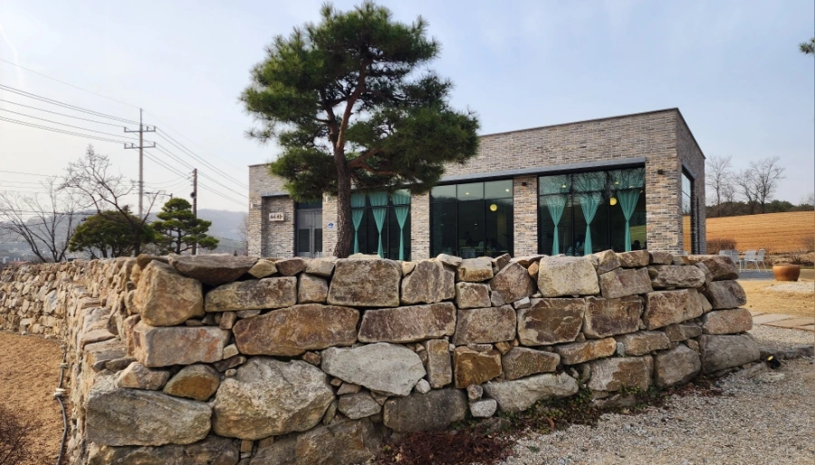 주차장에 차를 세우고 내려서 바라본 티하우스 서하의 모습인데, 나무와 축대로 인해 온전한 모습은 보이지 않는다.
