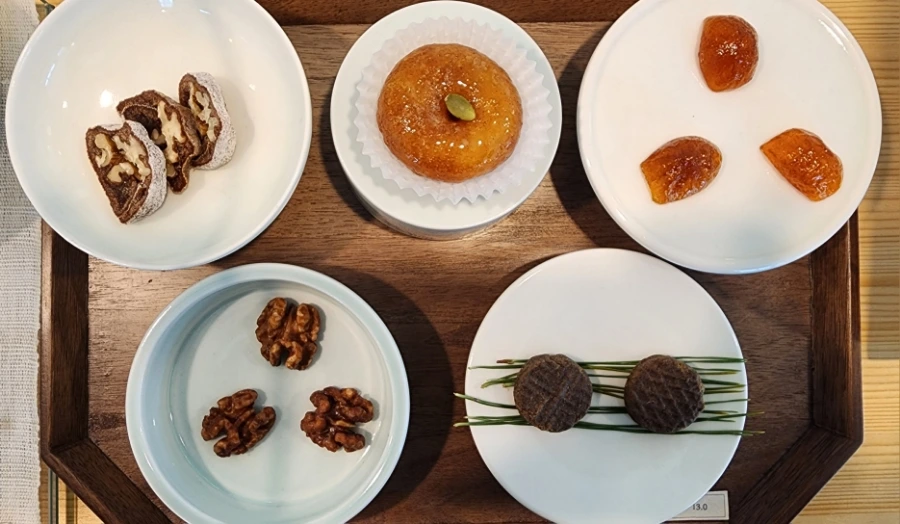 차와 함께 먹으면 좋을 듯한 먹거리들도 있는데, 평소엔 녹차 티라미슈나 치즈케익을 즐기지만 전통차에는 암만해도 우리네 음식이 더 잘 맞을 것 같아서 호두곶감말이를 주문해 봤다.