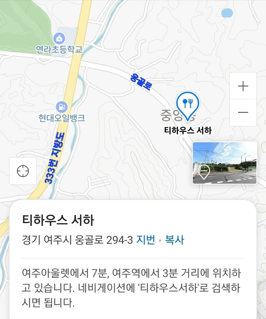 티하우스 서하의 위치는 아래 사진을 참조하면 되는데, 티하수스 서하의 홈피는 서하가 여주아울렛에서 7분, 여주역에서 3분 거리에 있다고 설명하고 있다.