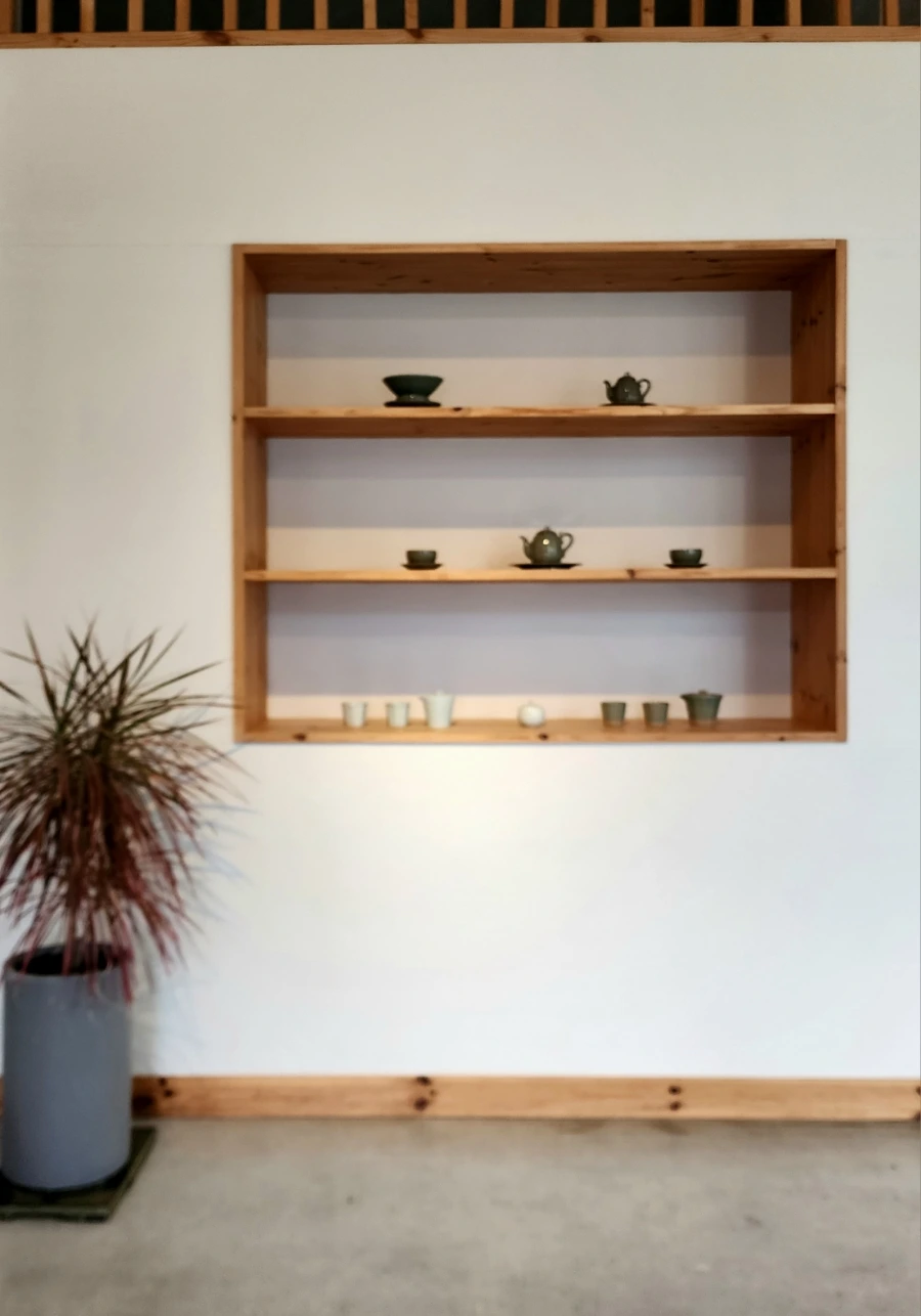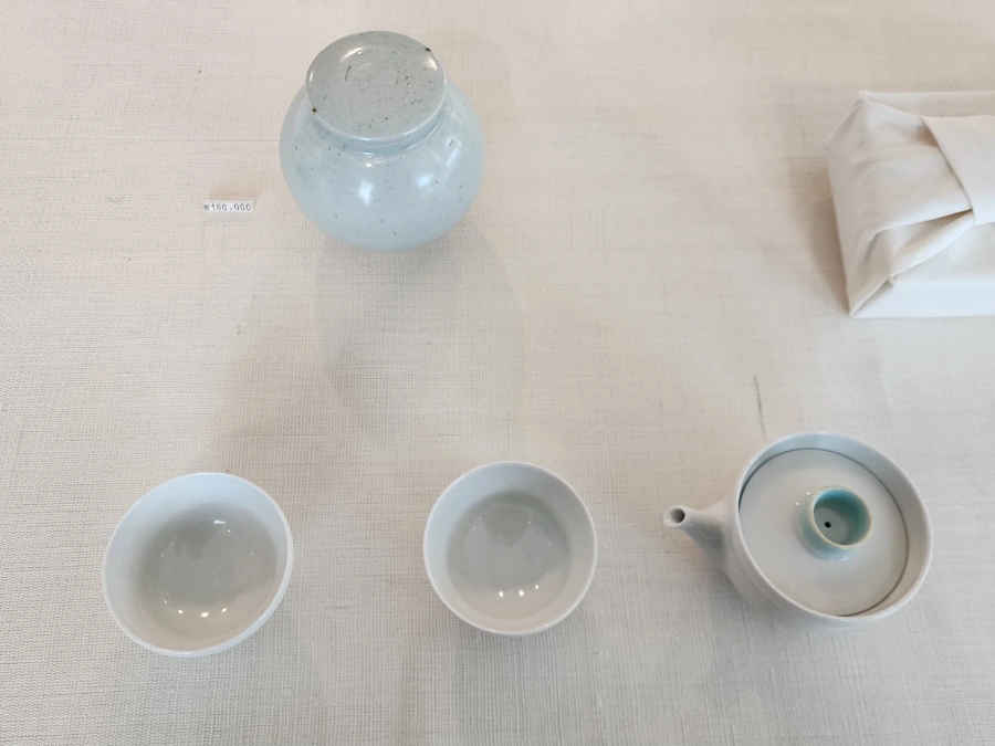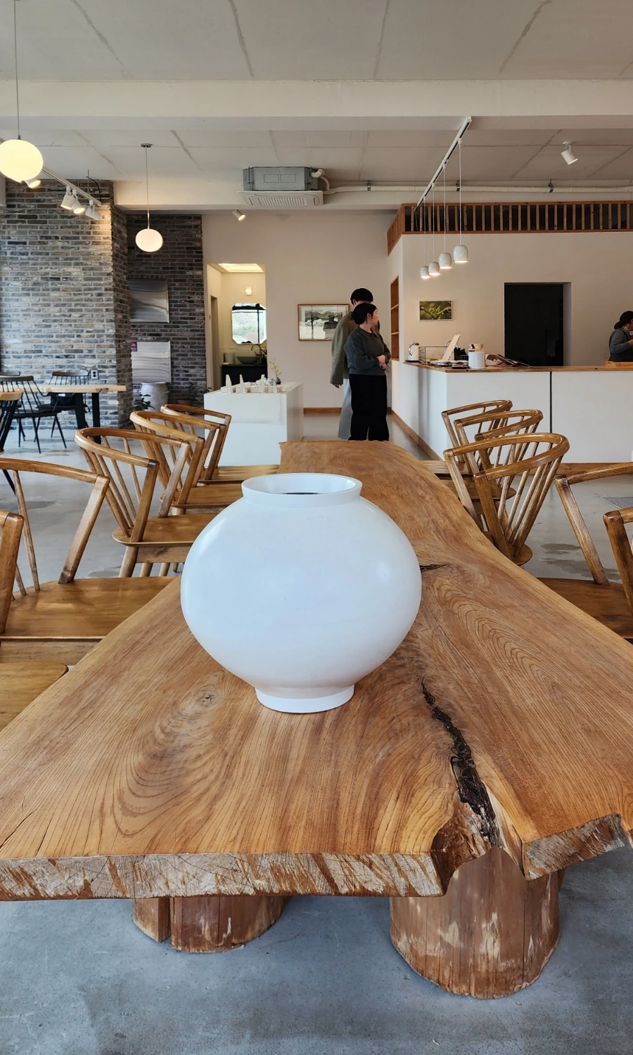 원목 테이블이 있는 공간을 반대쪽에서 바라보면 이런 모습인데, 테이블 뒤쪽으로 (판매도 하는) 다기세트 등이 전시되어 있다. 오른쪽으로 Order & Pick이 보인다.