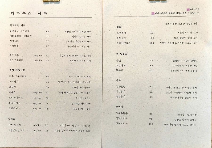 서하의 메뉴인데, 보다시피 핸드드립 커피도 있기는 하다. 다만 티하우스 서희에는 전통차가 잘 어울릴 듯해서 나는 녹차를 주문했고, 집사람은 대추 고구마라떼를 주문했다.