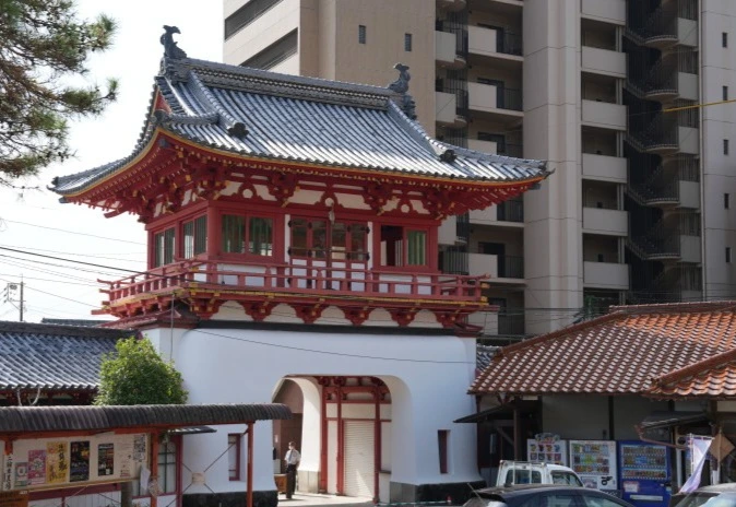 다케오 온천 루문의 모습인데, 다케오 온천의 루문은 용궁(龍宮)을 연상시키는 선명한 주홍색의 색채와 형태를 띠고 있다. 한편 다케오 온천 루문은 못을 한 자루도 사용하지 않은 독창적인 건축물로도 유명한데, 그 때문인지 다케오시를 소개하는 팜플렛에 제일 먼저 언급되어 있다.