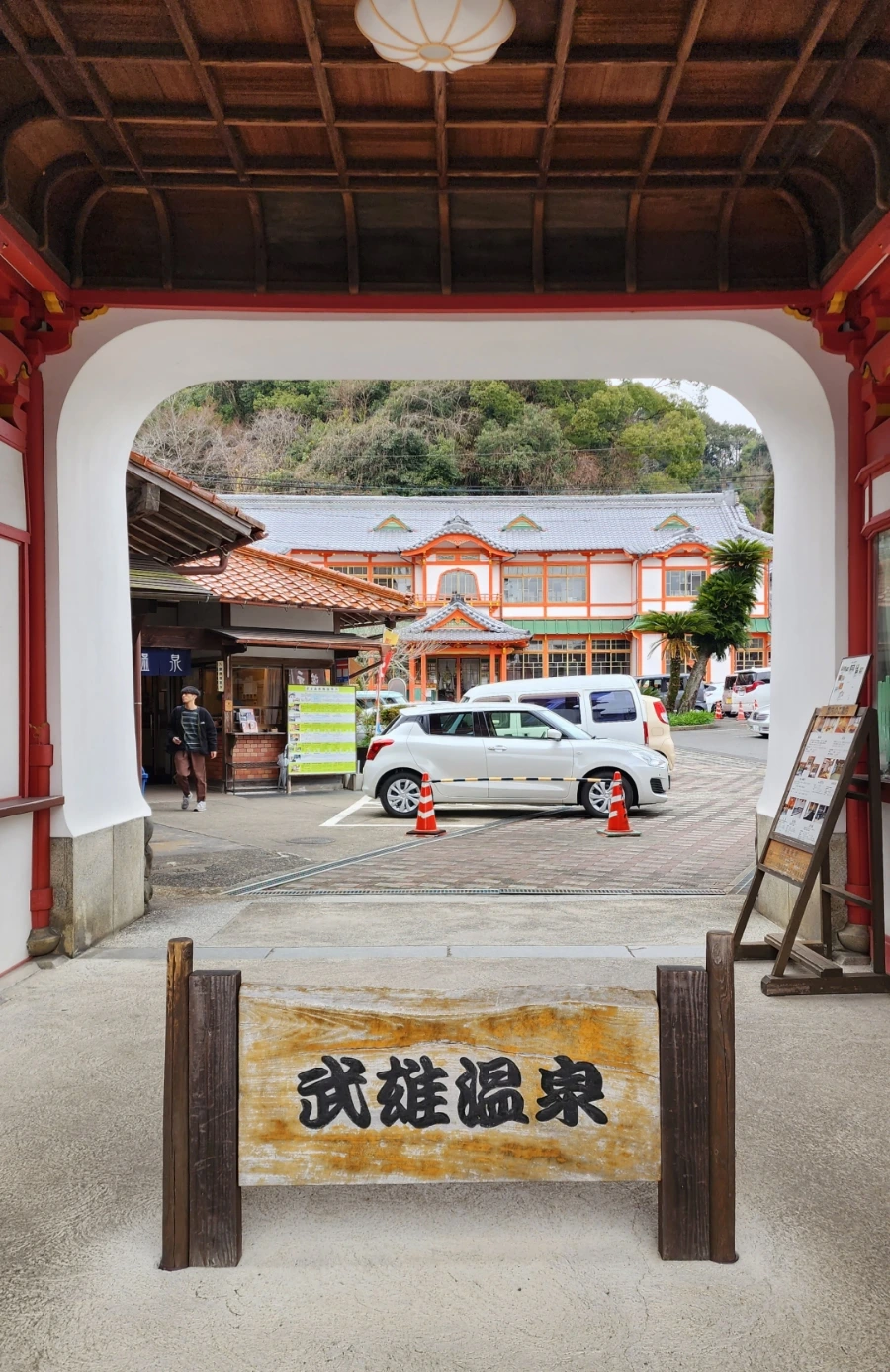 다케오 온천 루문 안쪽으로 주차되어 있는 차가 보이기는 하지만, 루문 밑으로는 차를 가지고 들어갈 수 없게 되어 있다. 이는 어딘가 다른 루트를 통해 자동차를 가지고 루문 안으로 들어가게 되어 있거나, 아니면 관계자에 한해 다케오 온천(武雄溫泉)이라고 쓰인 팻말을 치우고 들어갈 수 있다는 이야기가 된다.