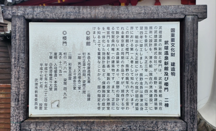 다케오 온천 루문은 사가현 가라쓰(唐津)시 출신으로 일본은행 본점과 도쿄역 역사를 지은 ‘일본 근대 건축의 아버지’ 다쓰노 긴고(辰野金吾1854 ~ 1919)의 설계로 다이쇼(大正) 4년, 즉 1915년에 지어졌다고 한다. 한편 아래 사진을 보면 루문 맞은편에 또 하나의 건물이 보이는데,