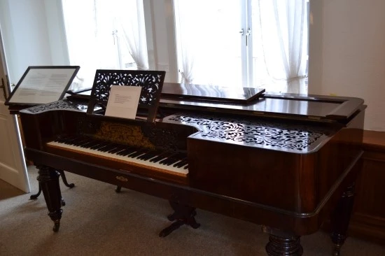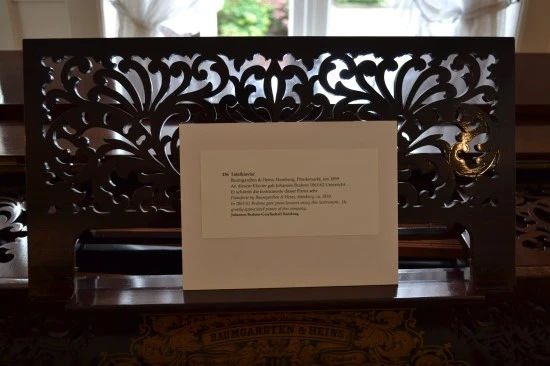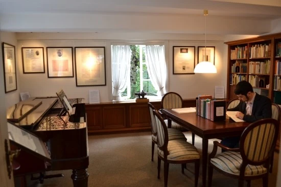흉상 뒤로 나있는 계단을 따라 위층으로 올라가면 2개의 전시실을 만나게 되는데, 제1전시실은 서가와 책상 그리고 피아노 한대가 전부인 아주 작은 공간이다. 아, 사진 왼쪽에 보이는 피아노는 브람스가 학생들에게 피아노 교습을 할 때 사용하던 것이라고 한다.