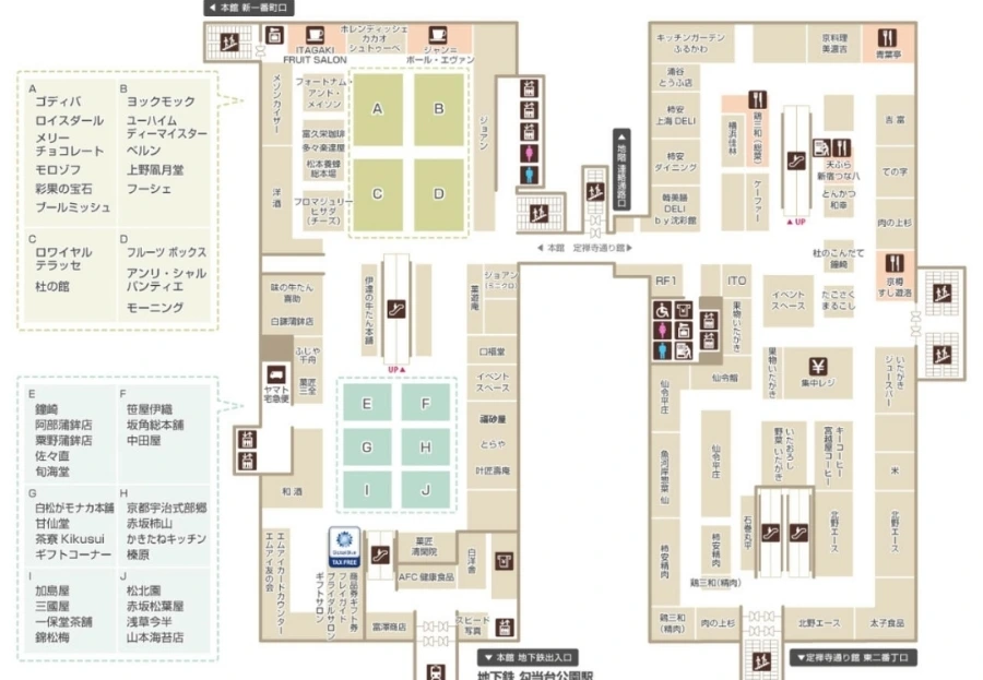 한편 센다이 미츠코시는 위 사진 중앙에 밝게 빛나고 있는 입구를 기준으로 왼쪽의 본관과 오른쪽의 죠젠지도오리칸(定禅寺通り館)이 결합된 형태로 되어 있는데, 아래 평면도를 보면 내 말을 쉽게 이해할 수 있을 것이다.
