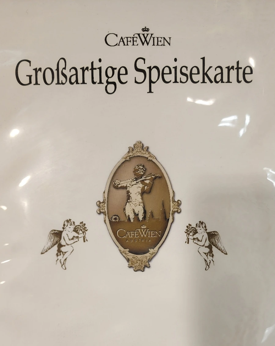 카페 안에 자리를 잡았을 때 종업원이 가져다준 메뉴판인데, 위쪽에 독일어로 Großartige Speisekarte(훌륭한 메뉴라는 의미)라고 쓰여 있다. 그리고 그 밑에는 빈 시립공원에서 만나는 요한 슈트라우스 2세의 동상이 보인다.