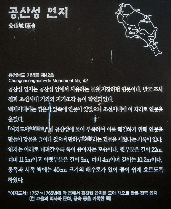 이곳은 공산성 안에서 사용하는 물을 저장하던 연못인 연지(蓮池)이다. 백제 때부터 계속해서 이용된 것으로 추정되는데, 전체적인 모습은 석축을 단이 지게 조금씩 좁혀 쌓아 마치 석탑을 거꾸로 세워 놓은 모양을 하고 있다.