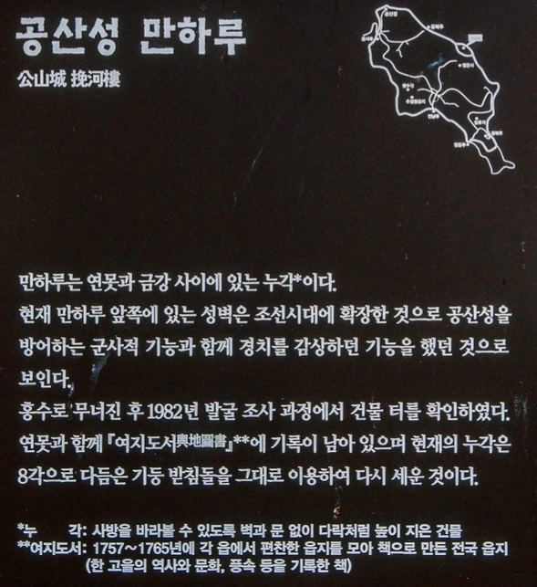 만하루(挽河樓)는 보다시피 연지와 금강 사이에 세워진 누각인데, 주된 기능은 군사적 기능이었을 것으로 추정되고 있다.