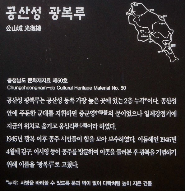 광복루는 공산성 동쪽 가장 높은 곳에 세워진 2층 누각으로, 원래는 공산성 안에 주둔하는 군대를 지휘하는 중군영(中軍營)의 문루였다고 한다. 그런데 일본애들이 이름을 웅심각(雄心閣)으로 고치고 지금의 자리로 옮겼는데, 광복 후 공주시민들이 힘을 모아 보수하였다고 한다. 그리고 1946년 4월 김구, 이시영 등이 공주를 방문한 후 광복을 기념하기 위해 '光復樓'로 이름을 고쳤다고.
