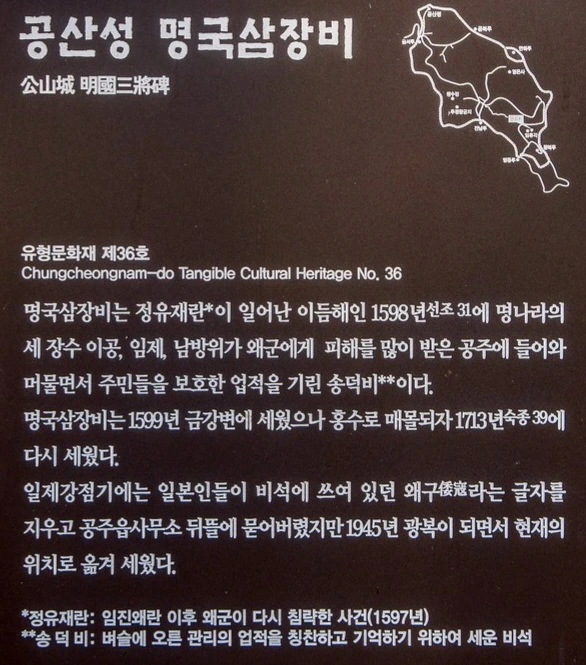 명국삼장비 안내판. 일제 강점기 때 일본애들에 의해 비석에 있던 왜구(倭寇)라는 글자가 사라졌고, 공주읍 사무소 뒤뜰에 매몰되기도 했다는 이야기가 쓰여있다.