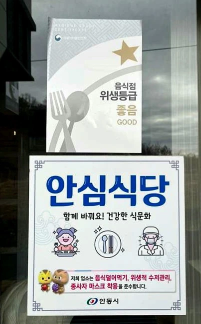입구 오른쪽 유리창에는 "안심식당", "위생등급 좋음"이라고 쓰여 있다.