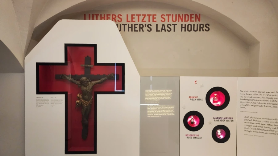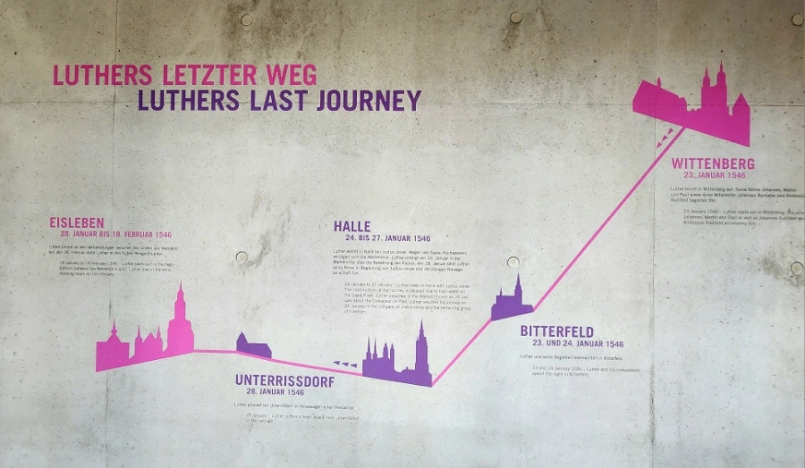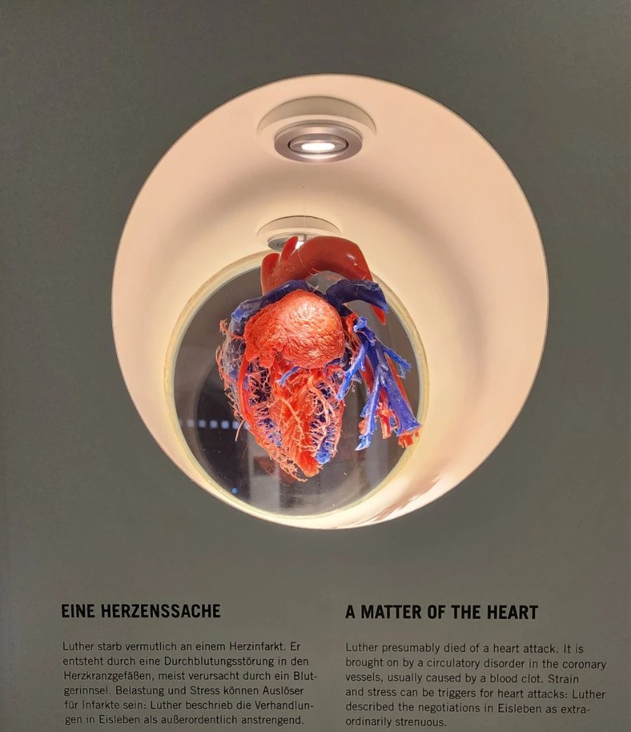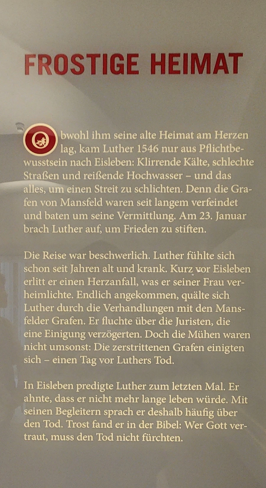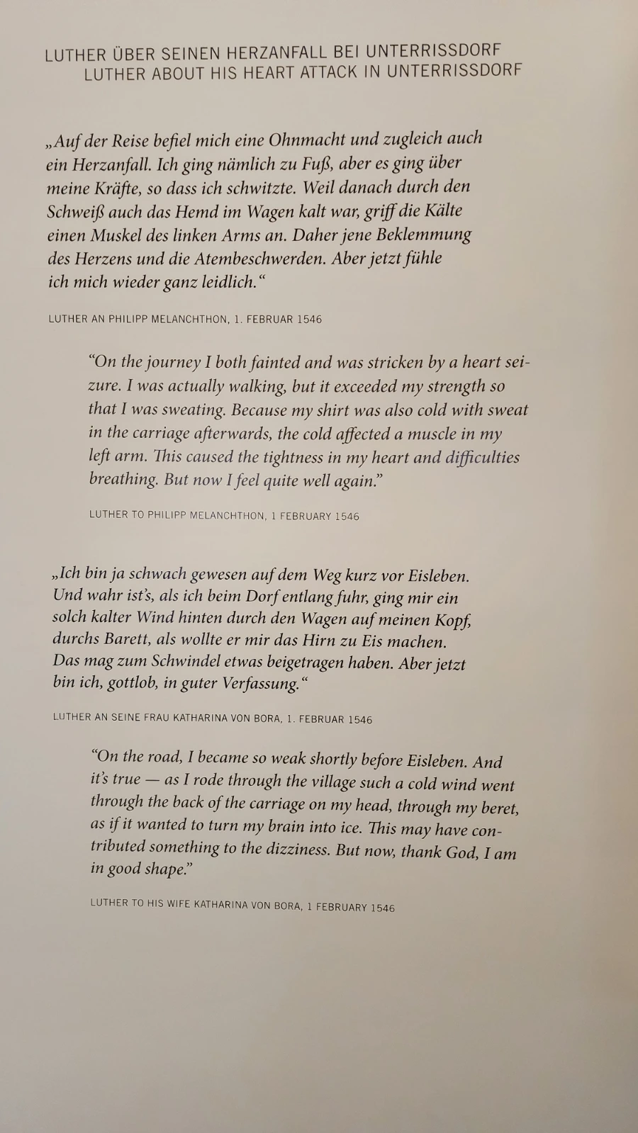 사실 이미 63살이 된 루터는 자신이 늙고 병들었다는 것을 알고 있었고, 심지어 아이스레벤으로의 여행길에 오르기 직전에는 이미 심장 통증으로 고생하고 있었다. 그런데 앞서 말한 사명감에 아내에게 조차 이 사실을 숨기고 길을 떠났다가 불귀의 객이 되고 만것이다. 이런 내용은 "루터 죽음의 집(Luthers Sterbhaus)"에 있는 아래 사진 속의 전시물에 자세히 적혀있다.