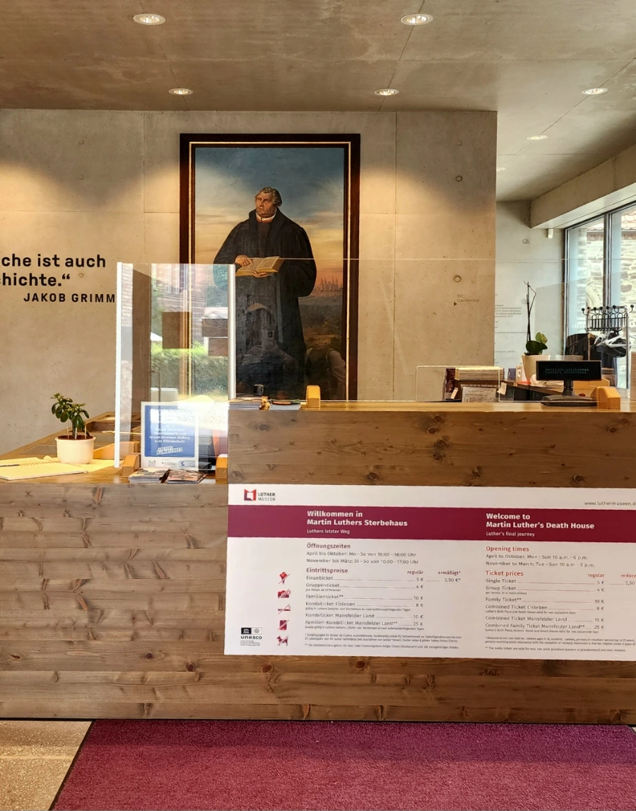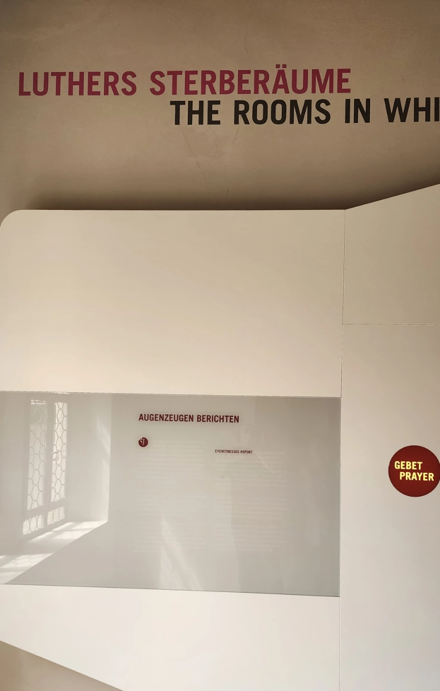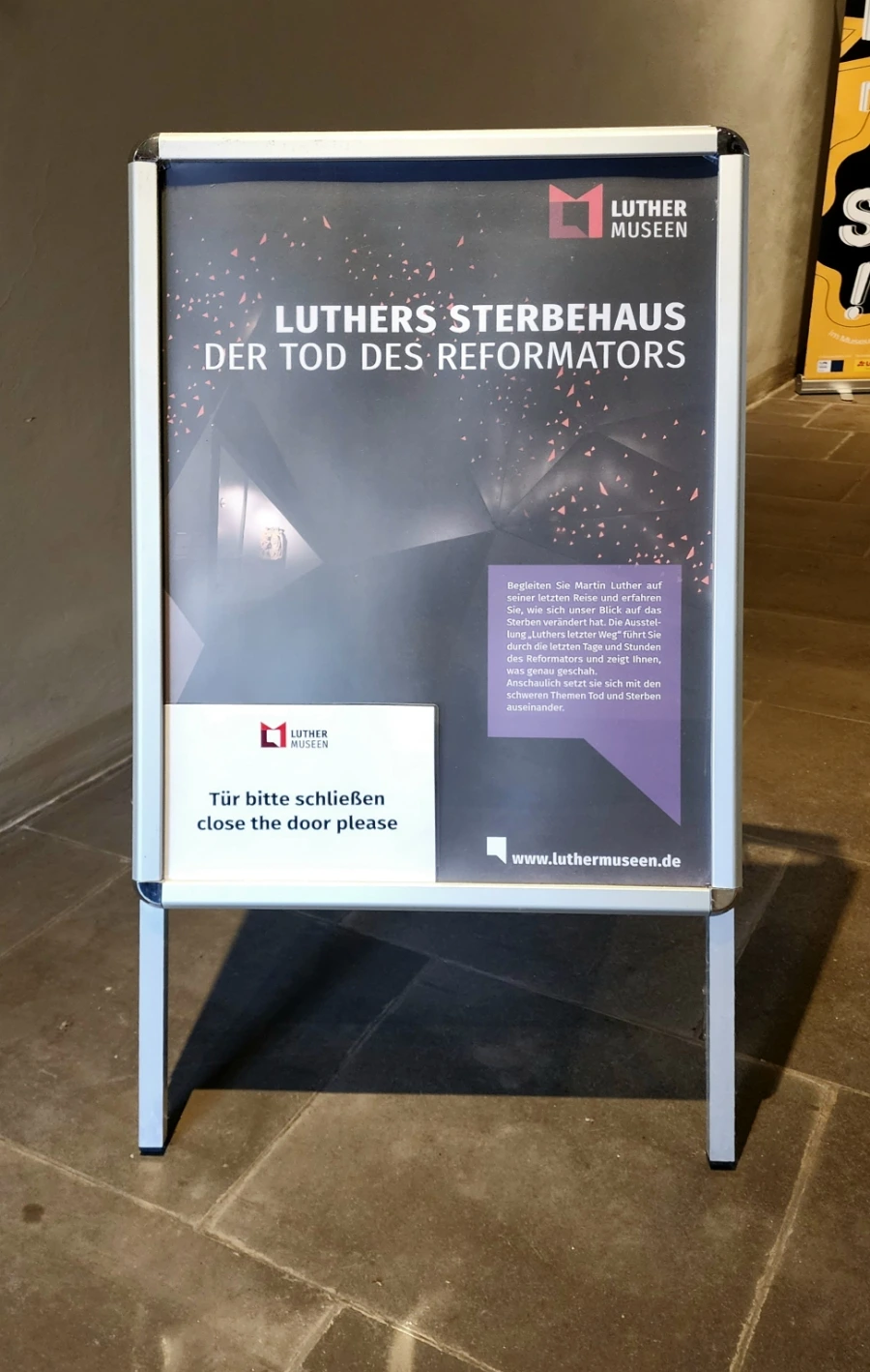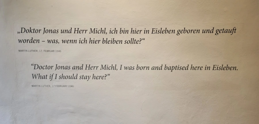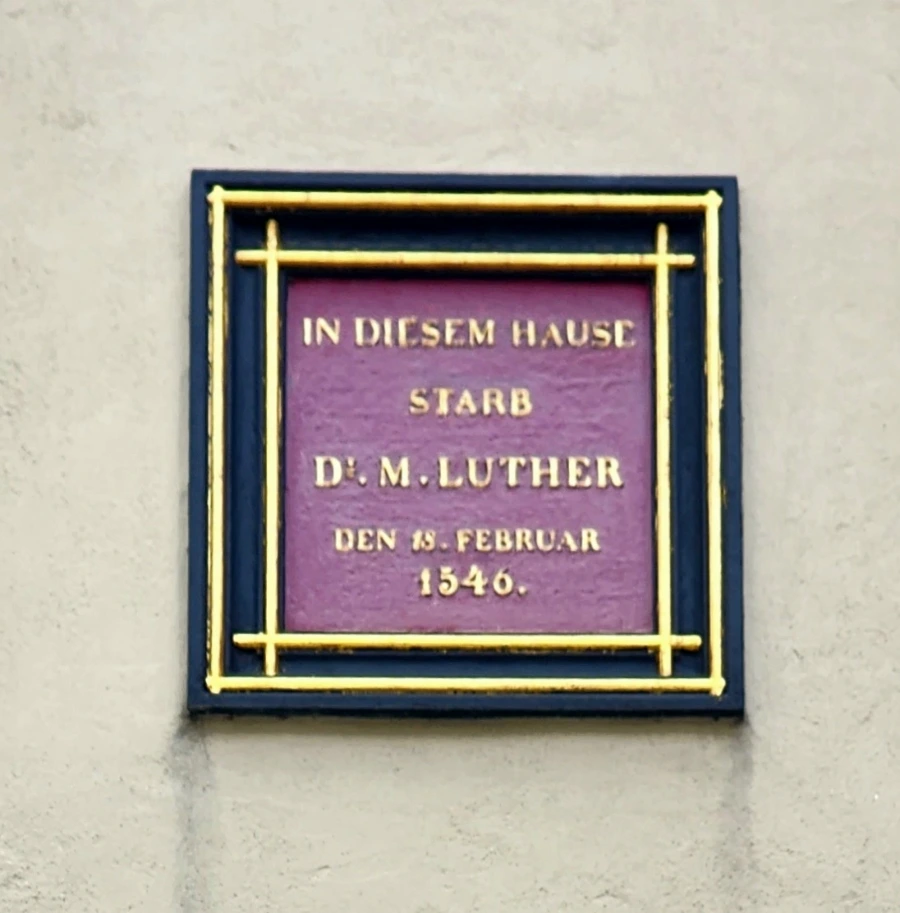 입구 위쪽 벽에 "이 집에서 마틴 루터 박사(Dr. Martin Luther)가 1546년 2월 18일에 사망했다"라고 쓰여 있다. 잘 알고 있는 것처럼 루터는 신학박사 학위를 받았고, 비텐베르크(Wittenberg) 대학에서 교수로 재직했었다.