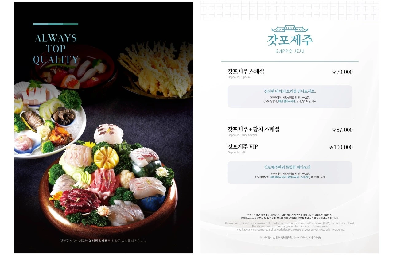 이처럼 무엇을 먹을가를 결정 못해 고민할 때 가볼만한 곳이 아산시 배방에 들어섰는데, 바로 "경복궁 & 갓포제주"가 그곳이다. 이름에서 알 수 있듯이 경복궁 & 갓포제주는 고기를 기본 아이템으로 하는 한정식으로 이미 유명세를 탄 '경복궁'과, 바다요리 전문점 '갓포제주'가 함께 하고 있는곳이다.