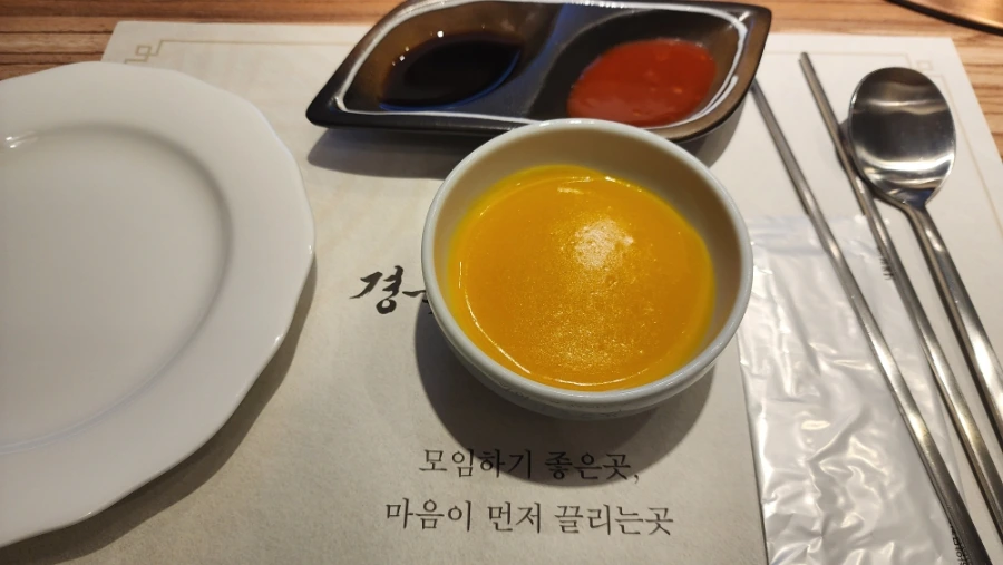이런 메뉴가 있음을 알게 된 후 집사람과 둘이서 식사를 하러 경복궁 & 갓포제주에 갔었고, 갓포제주런치정식을 주문했다. 갓포제주런치정식의 시작은 이렇게. 단호박죽으로...