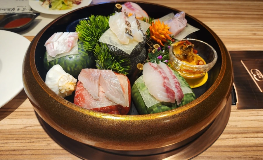 그리고 어쩌면 갓포제주런치정식의 메인이라고 할 수 있는 모듬회 한접시가 나온다. 도미, 광어, 농어, 히라스, 멍게 등이 두점씩.