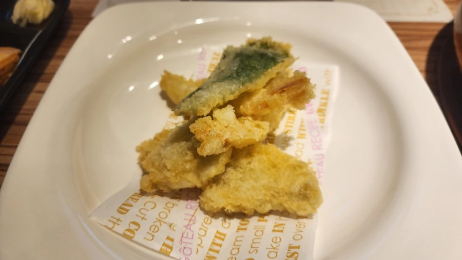 이크, 도미가 올라간 초밥이 4피스가 나왔었는데, 먹기에 바쁜 나머지 사진을 남겨 놓지 않았다. 이어서 튀김이 나오는데, 새우와 고구마가 2개. 근데 실수인지는 모르겠지마 아쉽게도 깻잎 튀김은 1개만.