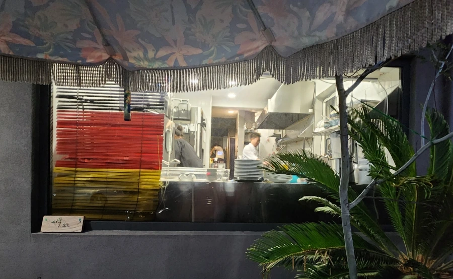 그리고 웨이팅 공간에 놓여 있는 의자 뒤편의 통유리창 너머로 조리공간이 보인다.