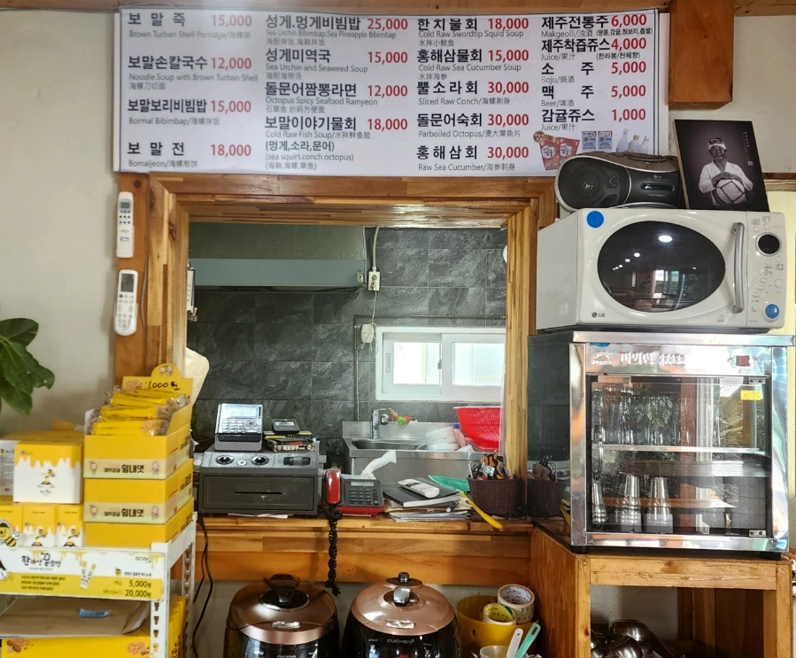 주방은 오픈되어 있고, 주방 위쪽에 메뉴판이 마련되어 있다.