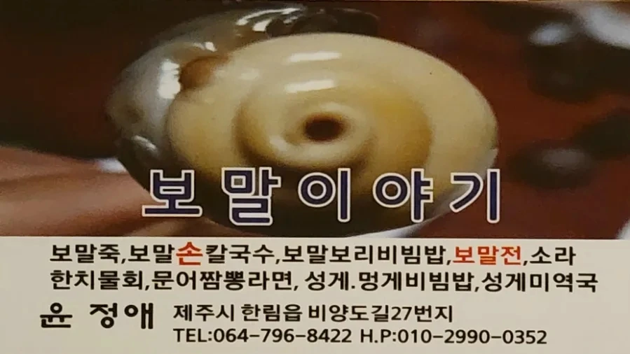 이런 지리적 불리함을 극복하고자 보말이야기를 운영하는 주인장은 배시간에 맞추어 항구에 나와 명함(아래 사진 참조)을 돌리며 가게 홍보에 열심을 내고 있다. 이 같은 당신의 적극적인 영업이 맘에 들어 "보말이야기"를 찾게 되었는데, 오늘 이야기는 그 방문후기에 해당한다.
