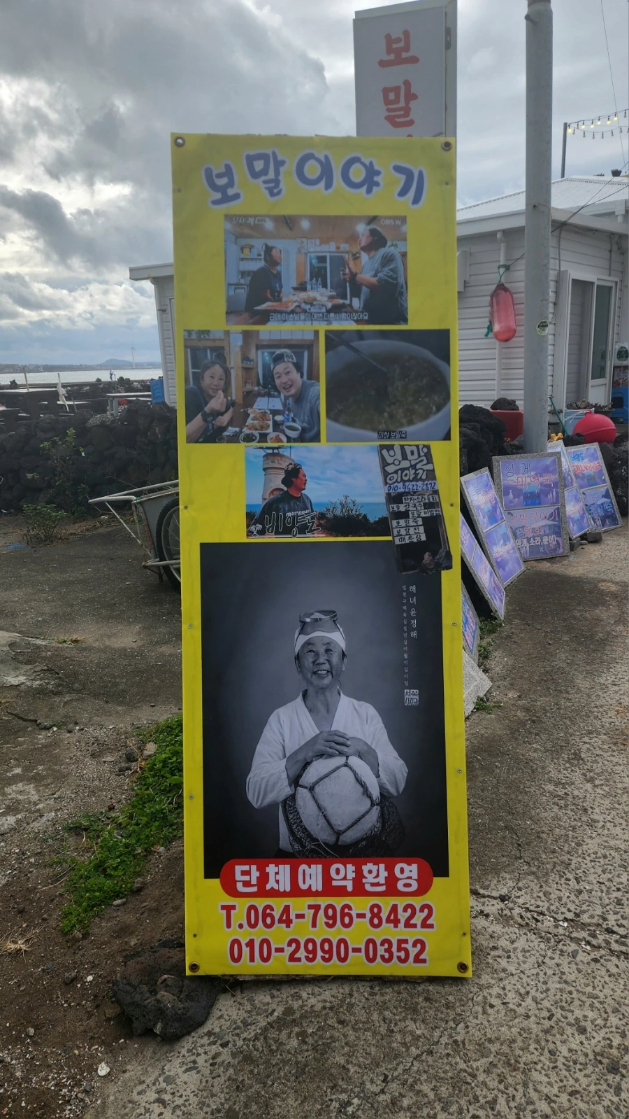 위치? 앞에서 이야기했듯이 보말이야기는 비양도항에서 내려 왼쪽(서쪽)으로 2-3분을 걸어가야 당도할 수 있는데, 제일 먼저 이래 사진 속의 입간판과 마주치게 된다. 입간판 속에 보이는 해녀분? 바로 보말이야기의 주인장이다.