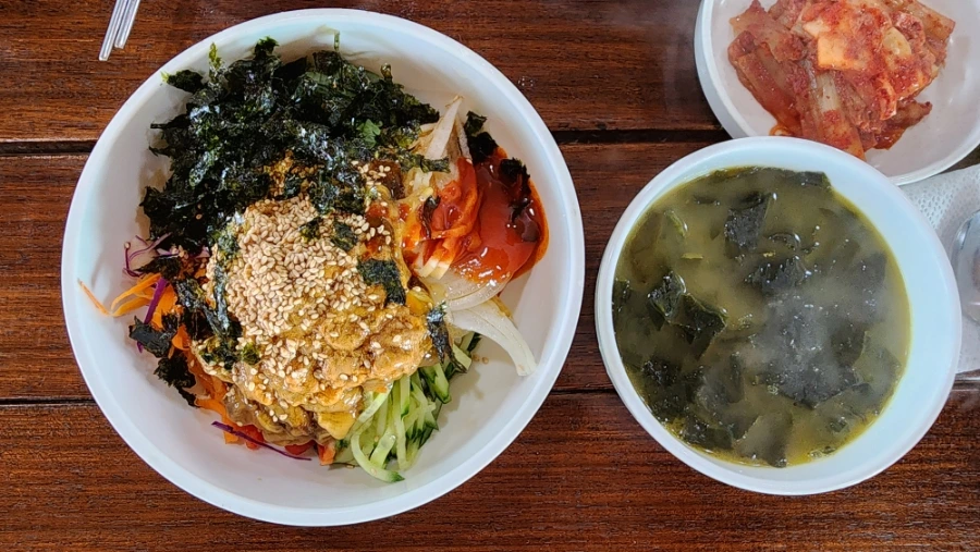 이어서 성게ㆍ멍게비빔밥이 나왔는데, 각종 야채가 듬뿍 들어가 있다. 그리고 그 위에 성게알(우니)와 멍게가 그야말로 그득히 올라가 있는데, 일단 비주얼 자체가 압권이다. 한편 우니가 이렇게나 많이 올라가 있는 비빔밥은 뭍에서는 여간해서 찾아보기 힘든데, 석석 비벼 먹어보면 맛 또한 압권이다. 아, 미역국 또한 일품이다.