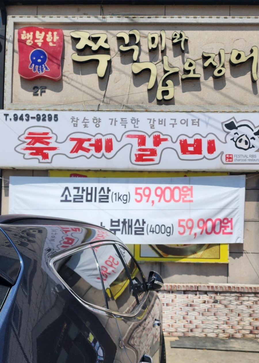 "행복한 쭈꾸미와 갑오징어"는 위 사진 속 오른쪽에 보이는 옅은 황색 건물 2층에 있는데, 1층에는 "축제갈비"라는 음식점이 자리하고 있다. 아, 축제갈비 또한 니름 맛집으로 알려져 있는지 손님이 아주 많아 보였다.
