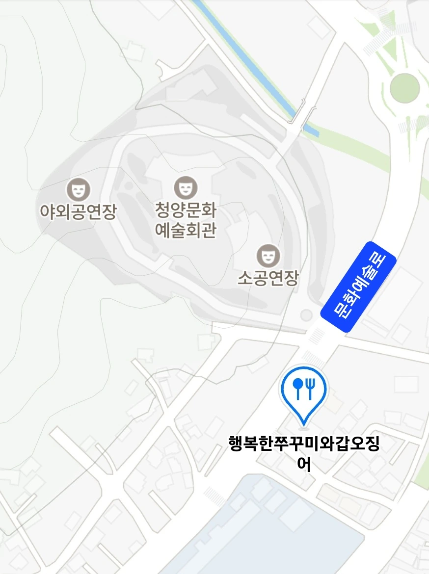 고향회관 청양점에서의 식사가 불발되었지만 그리 크게 당황하지는 않았다. 왜냐하면 이런 돌발적 사테가 있을 경우를 대비하여 (청양을 향해 출발하기 전에) 점찍어 두었던 또 다른 한 곳이 있었기 때문인데, 오늘 이야기하는 "행복한 쭈꾸미와 갑오징어"가 바로 그곳이다. "행복한 쭈꾸미와 갑오징어"는 아래 지도에서 보듯이 청양문화예술회관 앞을 달리는 문화예술로를 사이에 두고 청양문화예술회관과 대각선으로 마주 보고 있다. 물론 문화예술로에서 골목 안으로 약간 들어와 있기는 하다.