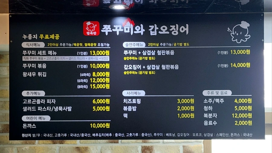메뉴판. 쭈꾸미 + 삼겹살 철판볶음과 갑오징어 + 삼겹살 철판볶음에 먼저 눈이 갔는데, 이것들은 술안주메뉴라거ㅗ 못을 박아 놓았다. 그렇다면 점심때의 식사메뉴는 쭈꾸미볶음과 쭈꾸미 세트메뉴, 그리고 왕새우튀김이 사실상 전부라는 이야기가 된다. 묵사발은 어느 경우든 기본적으로 제공되고, 고르곤졸라피자와 샐러드는 쭈꾸미세트메뉴에 포함되어 있으니 말이다.