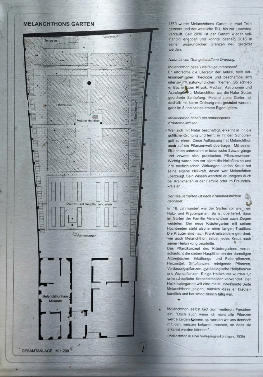 안내판에 따르면 멜란히톤의 정원은 1860년에 둘로 갈리워졌고, 그 가운데 핵심적인 영역은 옛 비텐베르크 대학인 LEUCOREA에 팔렸다고 한다. 그런 상태가 오래 이어지다가 2010년 이후에 다시 LEUCOREA측으로부터 소유권을 완전히 넘겨받았고, 2016년에 원래의 경계 안에 새로이 정원을 꾸미게 되었다고 한다.