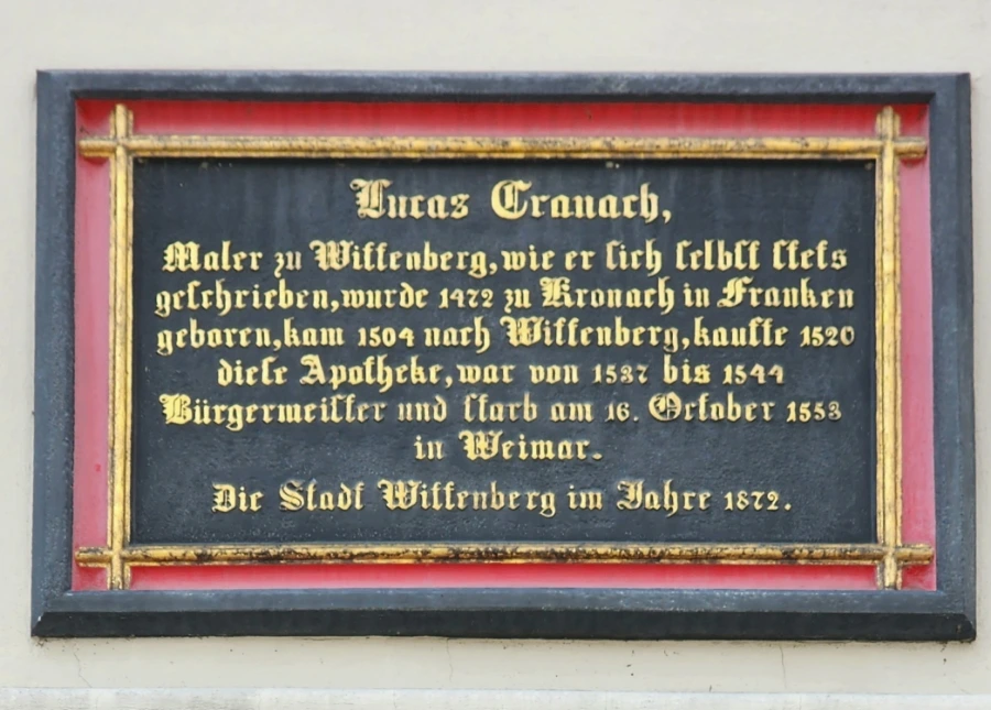 1472년에 크로나하(Kronach)에서 출생하여 1504년에 비텐베르크에 와서 1520년에 이 약국을 샀다. 1527년부터 1544년까지 비텐베르크 시장을 역임했고, 1553년 10월 16일에 바이마르에서 사망했다"라고 쓰여 있어.