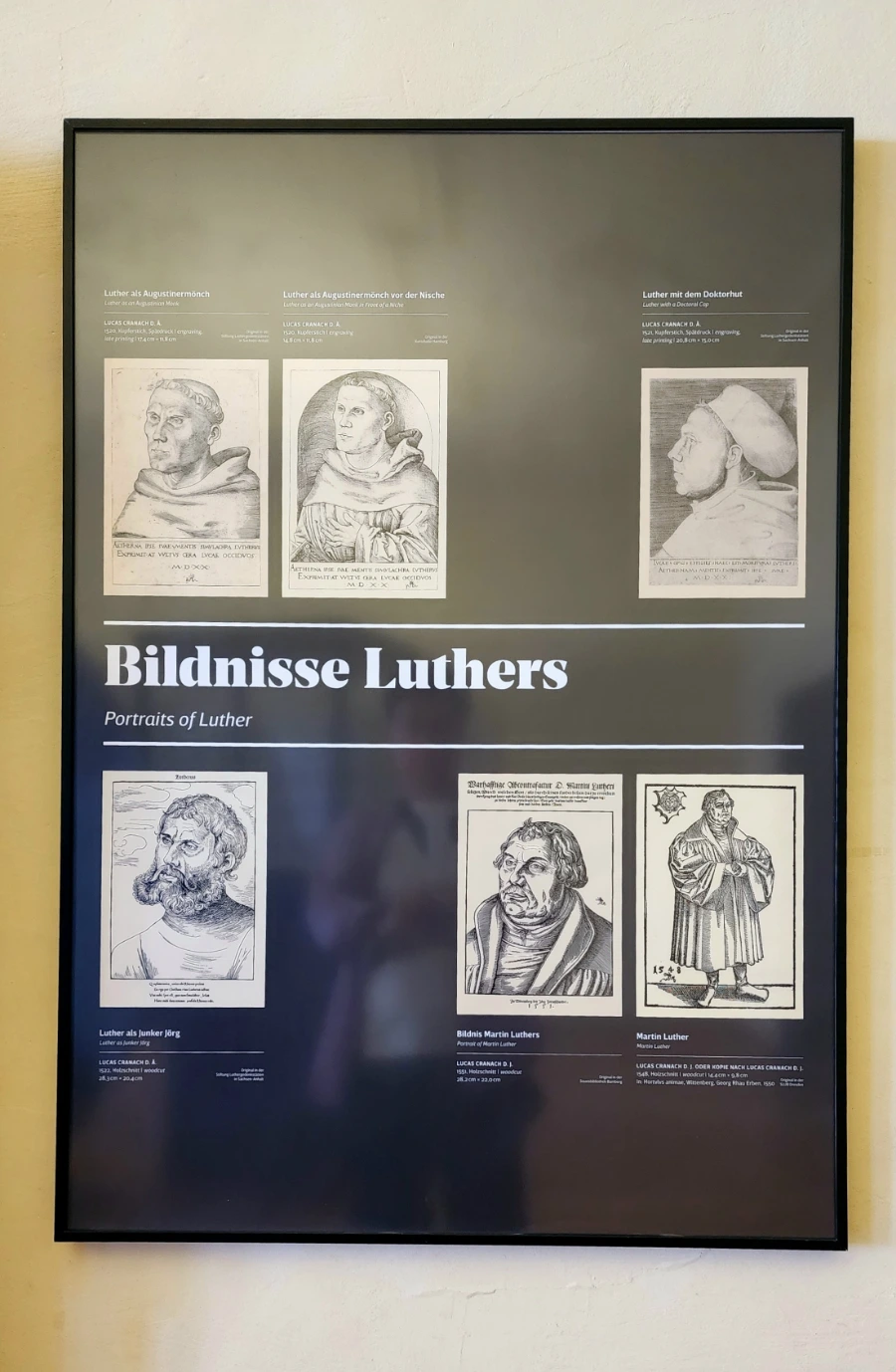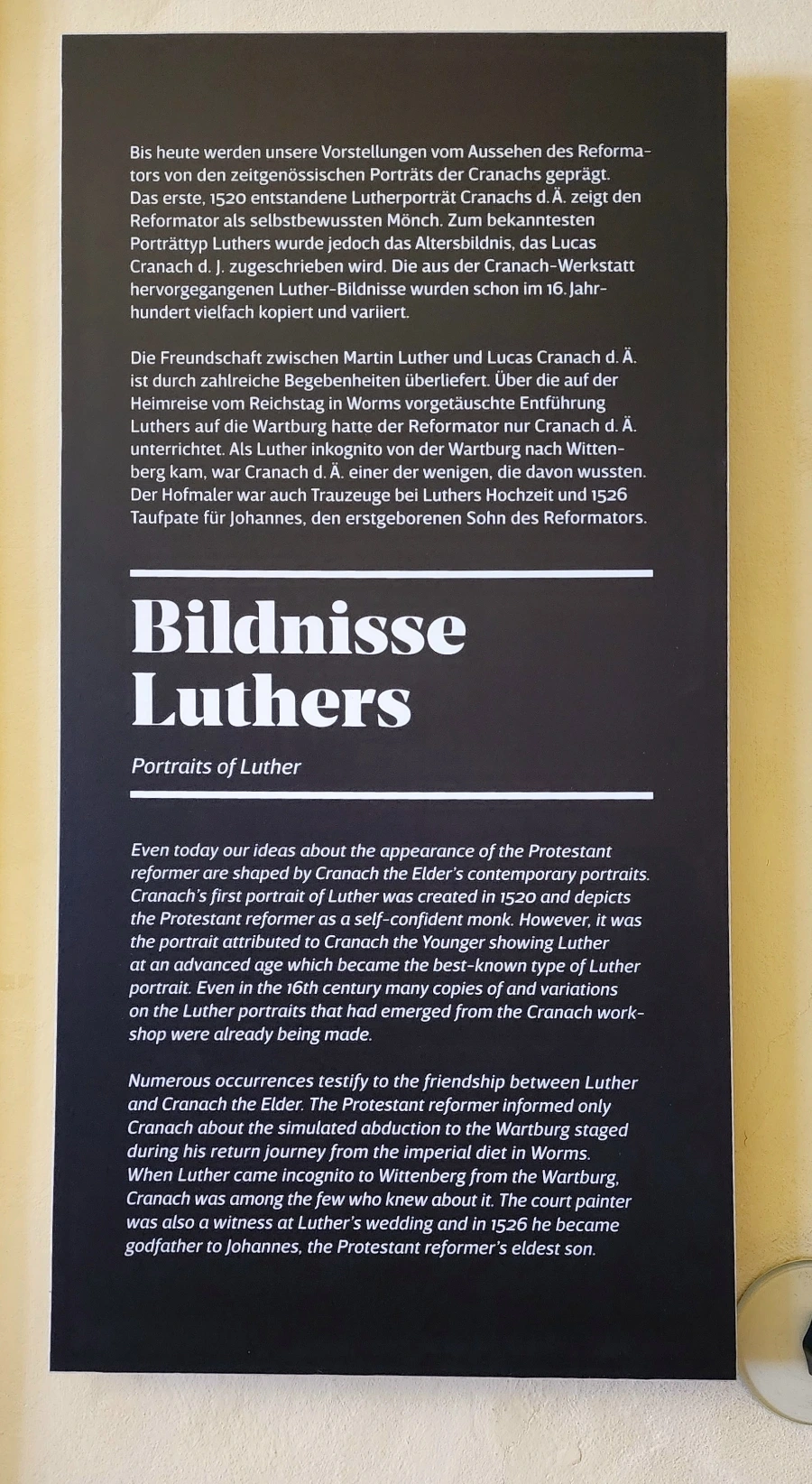 앞에서 이야기했듯이 크라나하와 루터는 친분이 두터웠다. 그런 두터운 친분을 바탕으로 하여 크라나하는 루터와 그의 부인, 그리고 부모님을 비롯한 가족들의 초상화를 그릴 수 있는 기회를 많이 가졌다. 뿐만 아니라 멜란히톤(Melanchton, 1497~1560)과 같은 친구 내지 동료들의 초상화도 많이 그렸다. 크라나하가 그린 루터의 초상화 가운데 가장 독특한 것으로는 루터가 교황으로부터 파문을 당한 뒤에, 수염을 잔뜩 기른 채 융커 외르크(Junker Jörg)라는 가명으로 바르트부르크(Wartburg) 성에 숨어 지내던 때의 모습을 담은 것을 들 수 있다. 크라나하의 집에는 이런 이야기부터 시작해서 루터의 모습을 담은 그림들까지 많은 자료들이 전시되어 있다. 쪽의 사진이 루터의 모습을 담은 그림에 관한 설명이고, 오른쪽이 루터의 모습이 담긴 그림들이다.