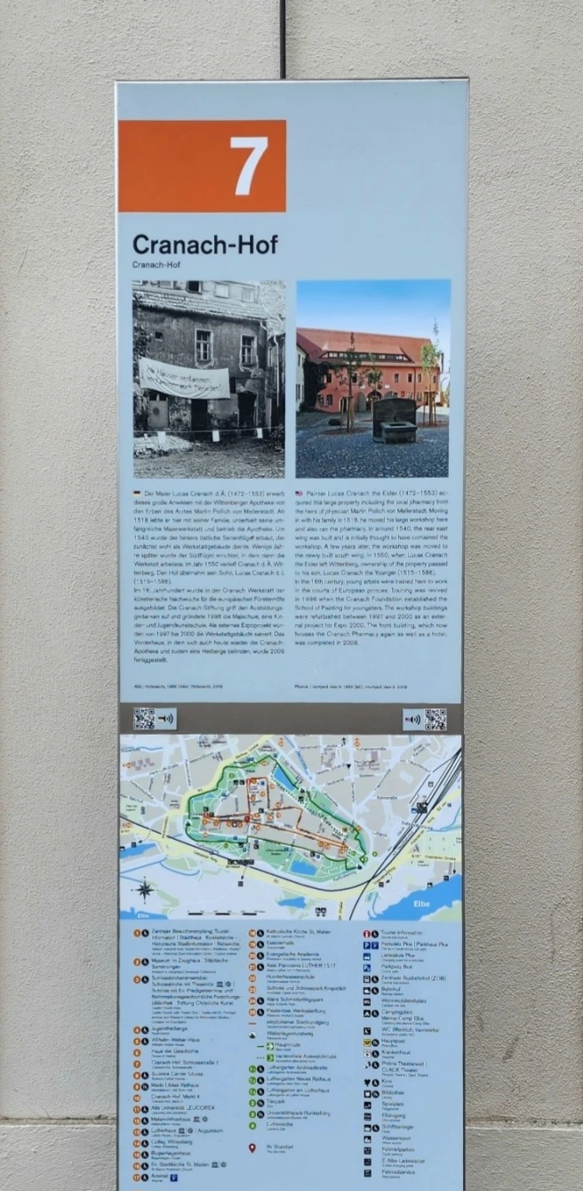 비텐베르크에서 크라나하를 만날 수 있는 곳으로는 제일 먼저 시청 광장에서 성 쪽으로 이어지는 거리인 슐로스슈트라세[Schlossstrasse: Schloss(성)+Strasse(거리)] 1번지에 있는 "크라나하 호프(Cranach-Hof)"를 들 수 있다. 밝은 베이지색(?) 건물인 크라나하 호프 앞에 안내판이 세워져 있는데, 현재 이곳엔 크라나하 약국(Cranach Apotheke)과 '크라나하 헤어베르게(Cranach Herberge)가 들어서 있다.