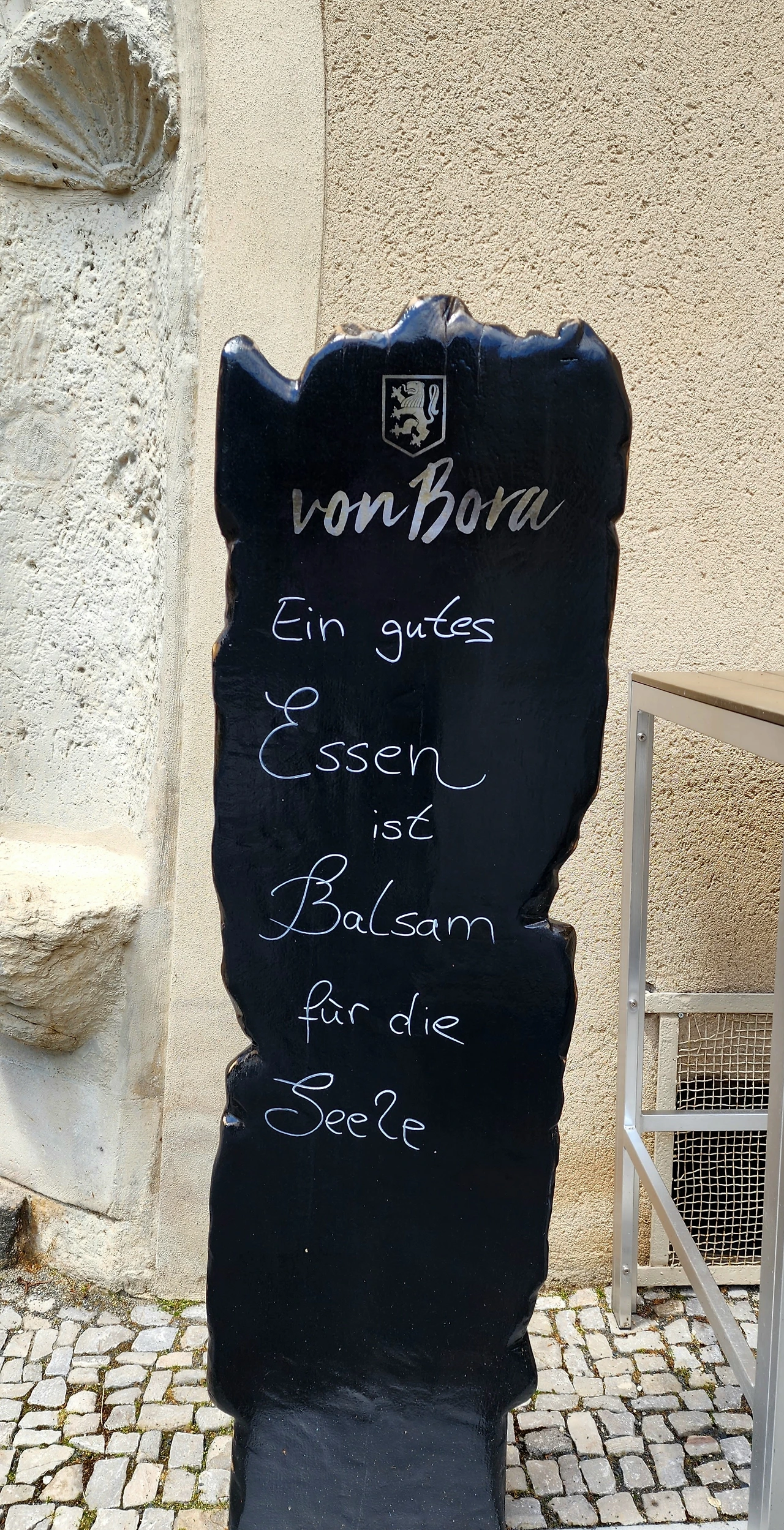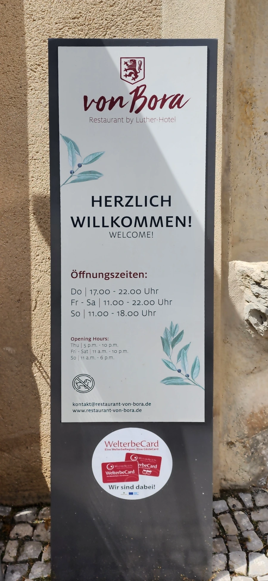 비텐베르크에서의 점심을 루터의 집 옆에 있는 (루터호텔이 경영하는) 레스토랑 von Bora에서 하려고 찾아갔다. 입구에 쓰여있는 "맛있는 식사는 영혼에 있어 발삼(Balsam) 향과 같은 것이다"에 전적으로 동감하며 문 앞에 섰는데, 문이 열리지 않는다.