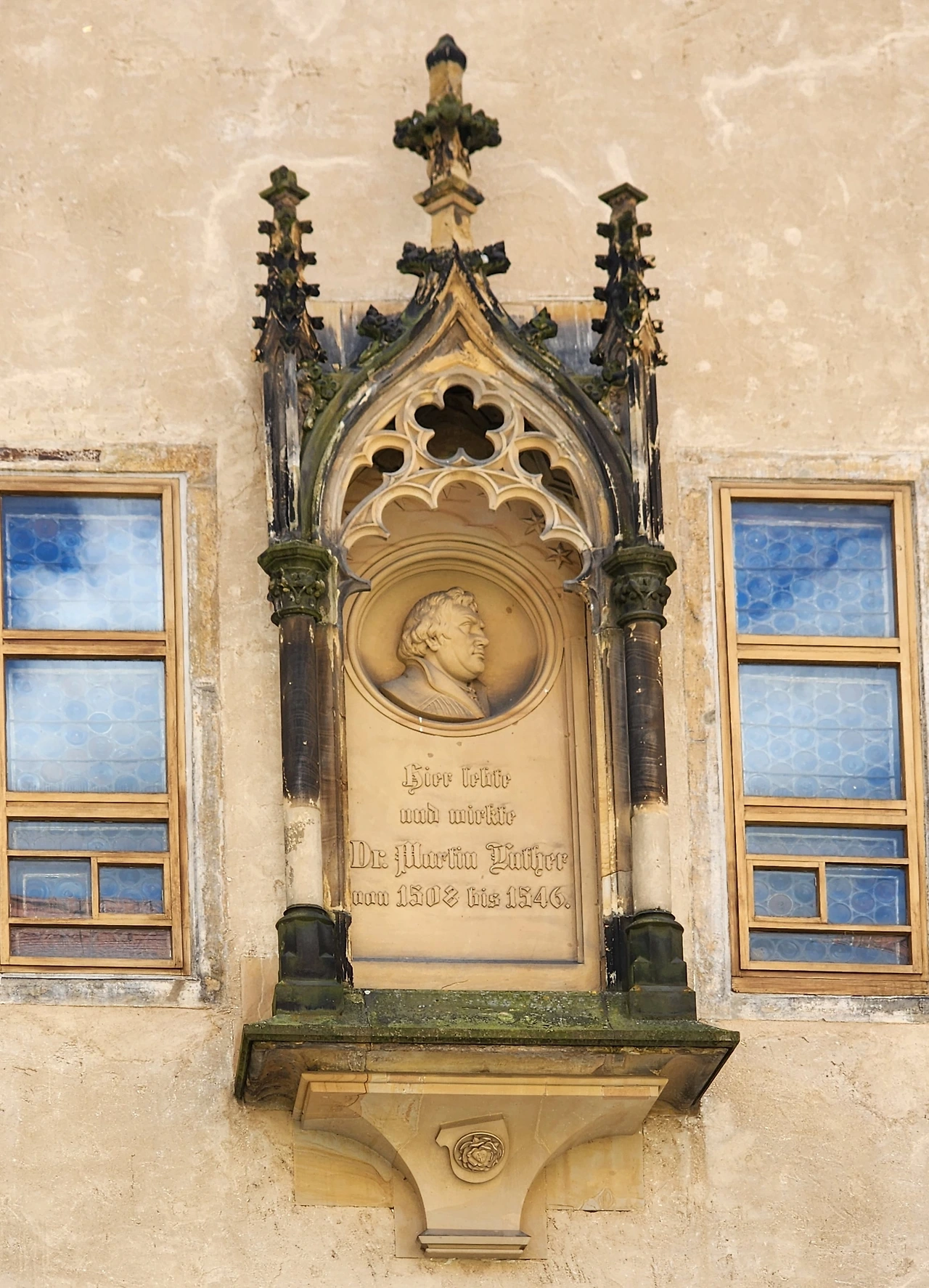 루터의 집 중앙에 보이는 부조인데, 부조에는 "1508년부터 1546년까지 이곳에서 루터가 살았고, 활발하게 활동하였다"라고 쓰여 있다.