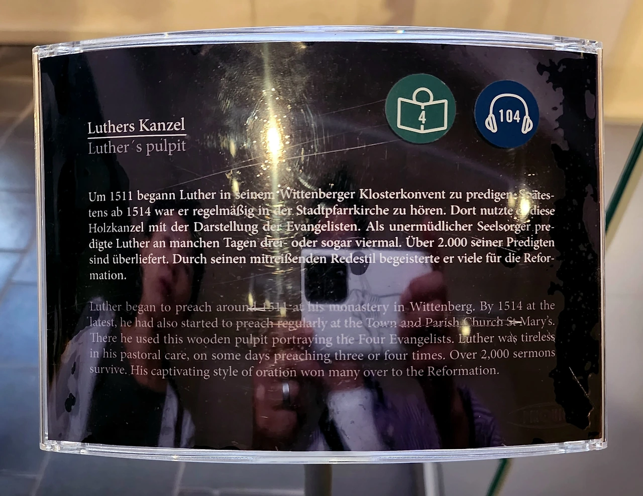 루터의 설교단에 관한 안내판에는 다음과 같은 이야기가 적혀있다. "루터는 1511년에 비텐베르크 수도원에서 설교를 시작했고, 적어도 1514년부터는 성 마리엔교회에서 정기적으로 설교를 했다. 그리고 그곳에서 설교를 할 때 설교단을 사용했다. 지칠 줄 모르는 목회자였던 루터는 많은 날들을 하루에 3번 심지어 4번씩이나 설교를 했으며, 설교 횟수는 2000번을 넘어섰다. 그의 감동적인 설교는 많은 사람들에게 종교개혁에 대한 열망을 불러일으켰다."