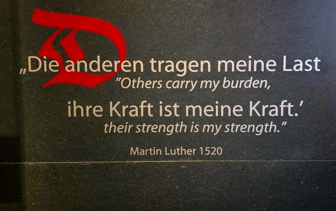 "다른 사람이 내 짐을 들어주면, 그의 힘이 곧 나의 힘이 된다."라는 이 말은 루터가 1520년에 한 말이다. 1520년이면 1517년에 면죄부 판매에 대한 95개조의 반박문을 성교회에 내건 후 가톨릭으로부터 많은 박해를 받던 힘든 시절인데, 당시에 루터가 처한 상황 그리고 그의 마음을 절로 떠 울리게 만드는 말이다.