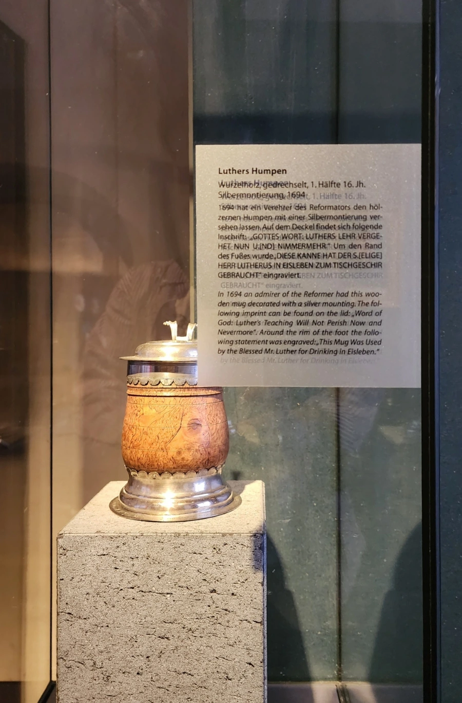 이 Humpen에 대해서는 자세한 설명이 붙어 있는데, 그 내용은 다음과 같다: 16세기 초반, 즉 루터가 사용하던 때는 나무로 되어 있었으나, 1694년에 루터의 숭배자들이 머리 부분을 은으로 장식했다. 뚜껑에는 "하나님의 말씀: 루터의 가르침은 지금도, 또 앞으로도 영원히 사라지지 않을 것이다"라고 새겨져 있다.