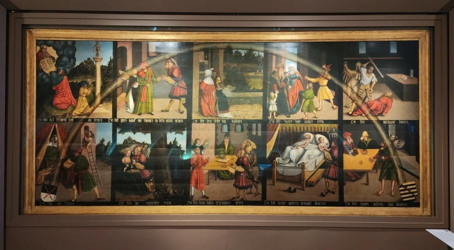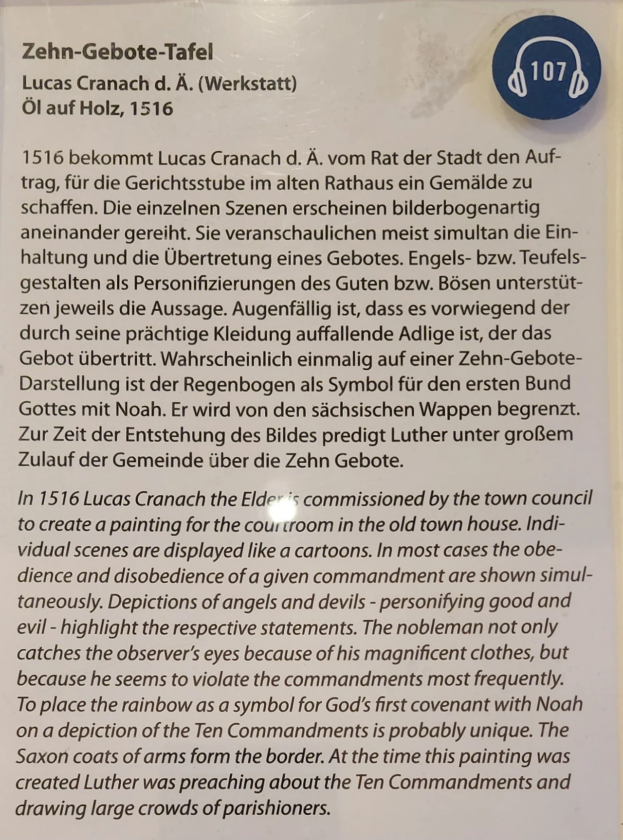 그림 옆에 그림에 관한 설명이 있는데, 그에 따르면 이 그림은 그에 따르면 1516년에 크라나하가 시의회로부터 구 시청사에 그림을 하나 그려달라는 부탁을 받아 그린 그림이라고 한다. 재미있는 것은 하나의 화면에 계명을 따르는 것과 계명을 어기는 것을 동시에 보여 주고 있다는 것인데, 선인과 악인의 모습을 한 천사와 마귀가 그와 같은 설명을 해주고 있다.