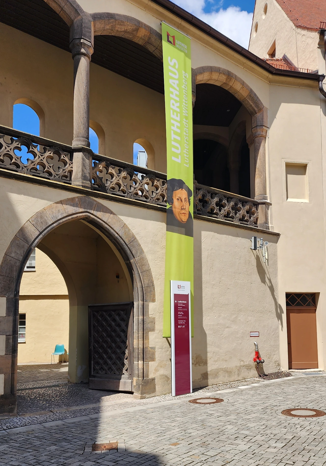 아래 사진 속의 건물이 루터의 집의 출입구에 해당하는데, 건물 위에 아래까지 드리워진 현수막에는 "마틴 루터의 삶과 그의 업적, 그리고 그것이 세상에 미친 영향"이라고 쓰여있다.