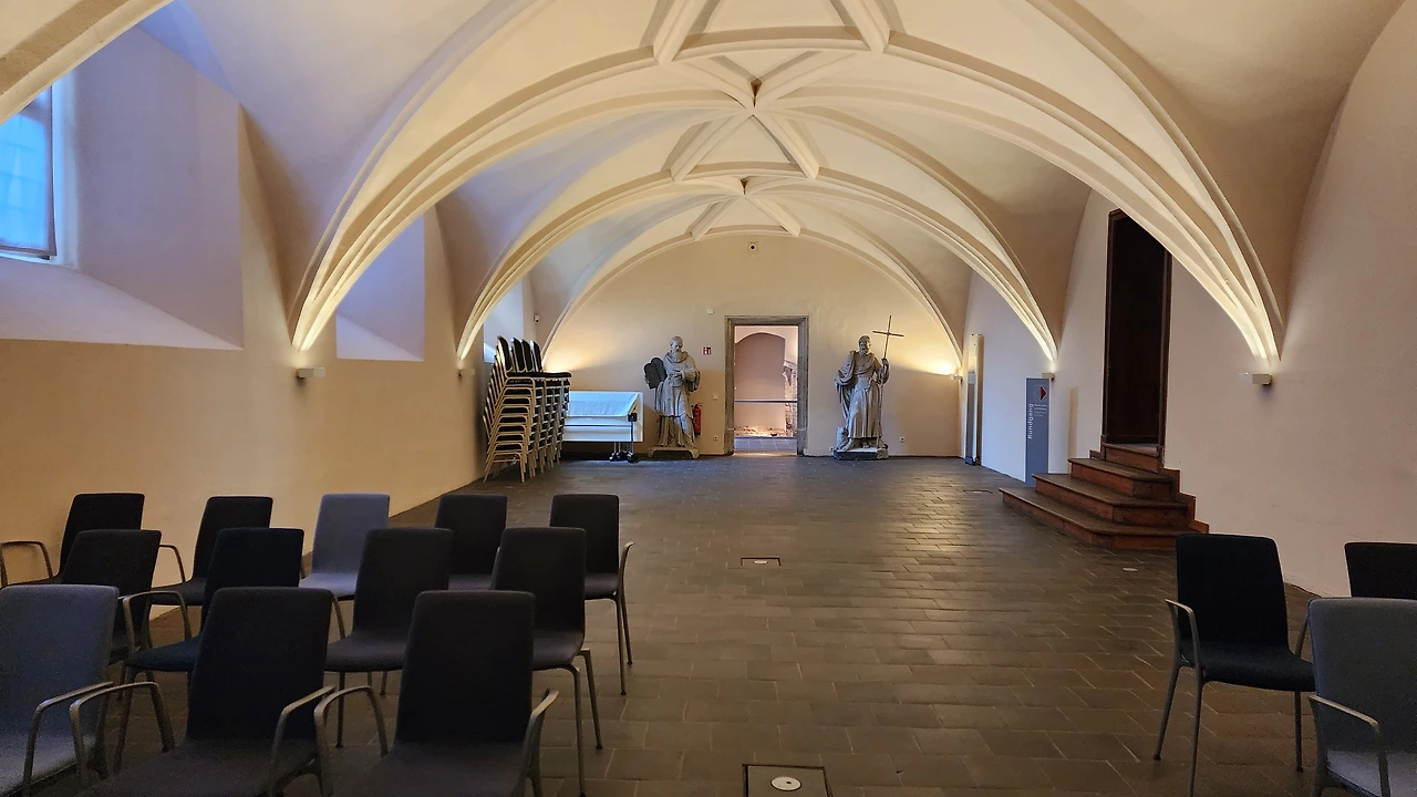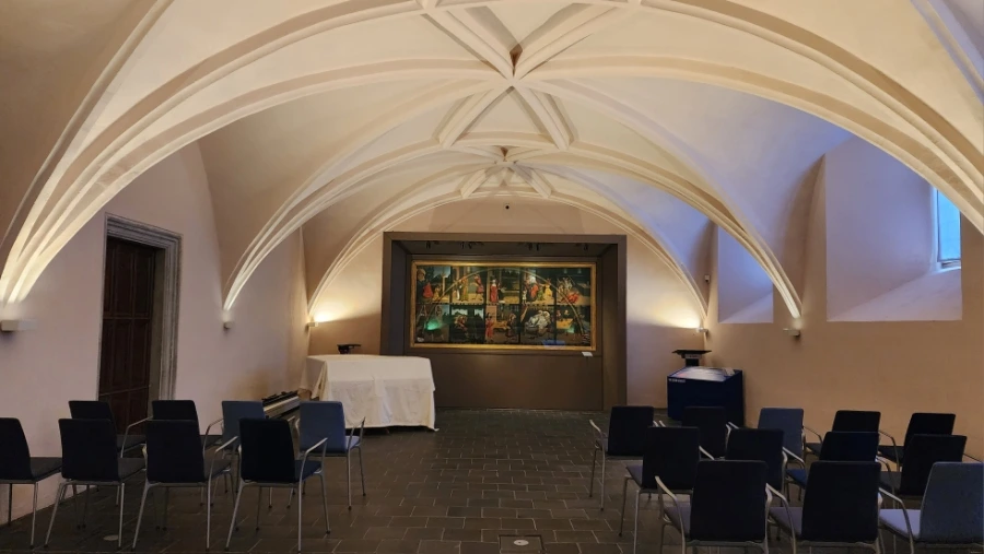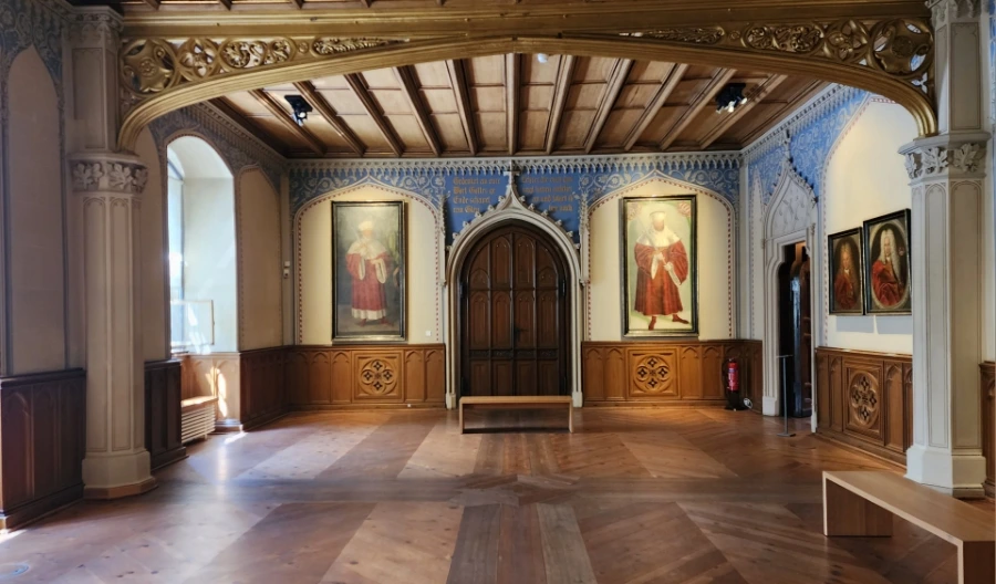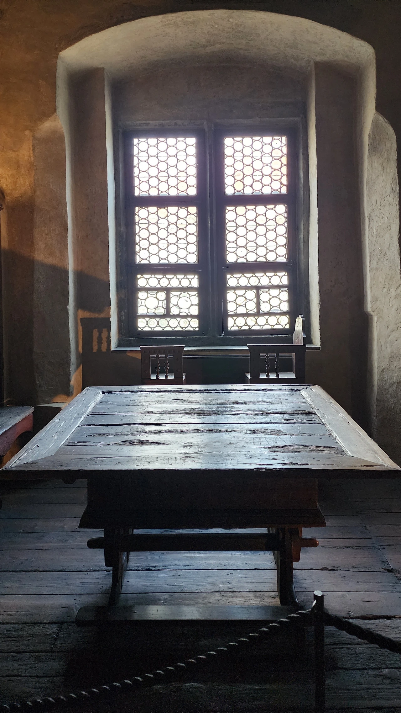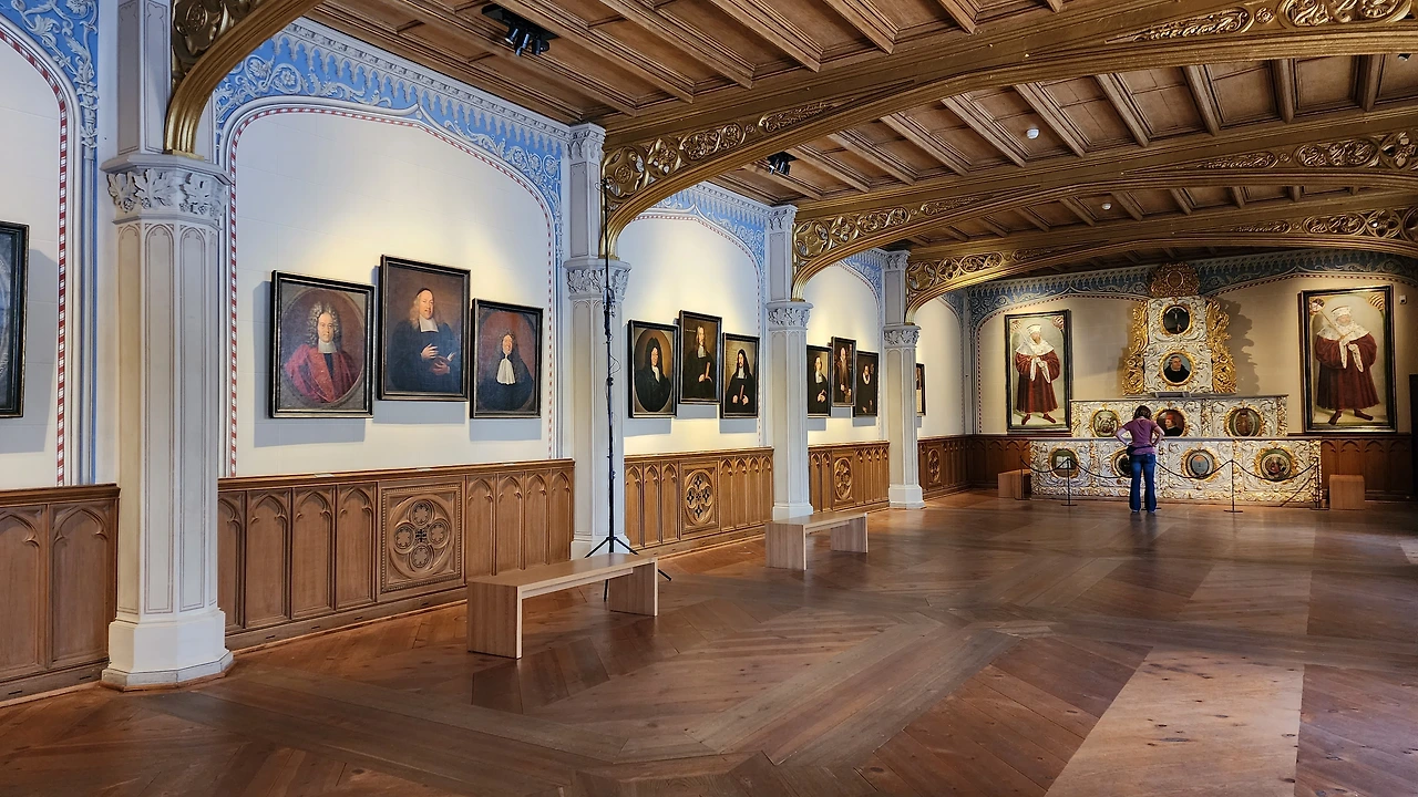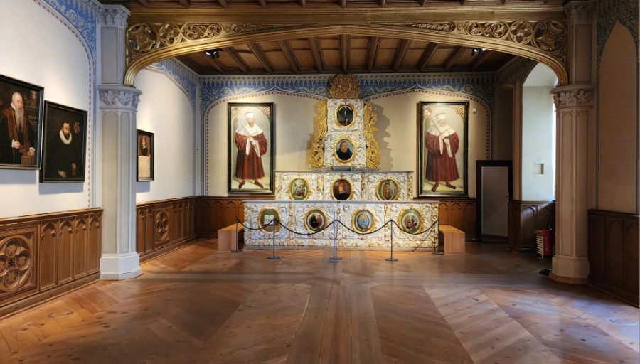 이 방은 1535년부터 1538년에 걸쳐 이러한 모습을 갖추게 되었다. 벽의 패널, 바닥, 책상, 상자의 시트, 의자 등은 모두 당시부터 있었던 오리지널이다. 아, 난로는 1602년에 설치되었고, 그림들은 1602년과 1630년에 그려졌다.