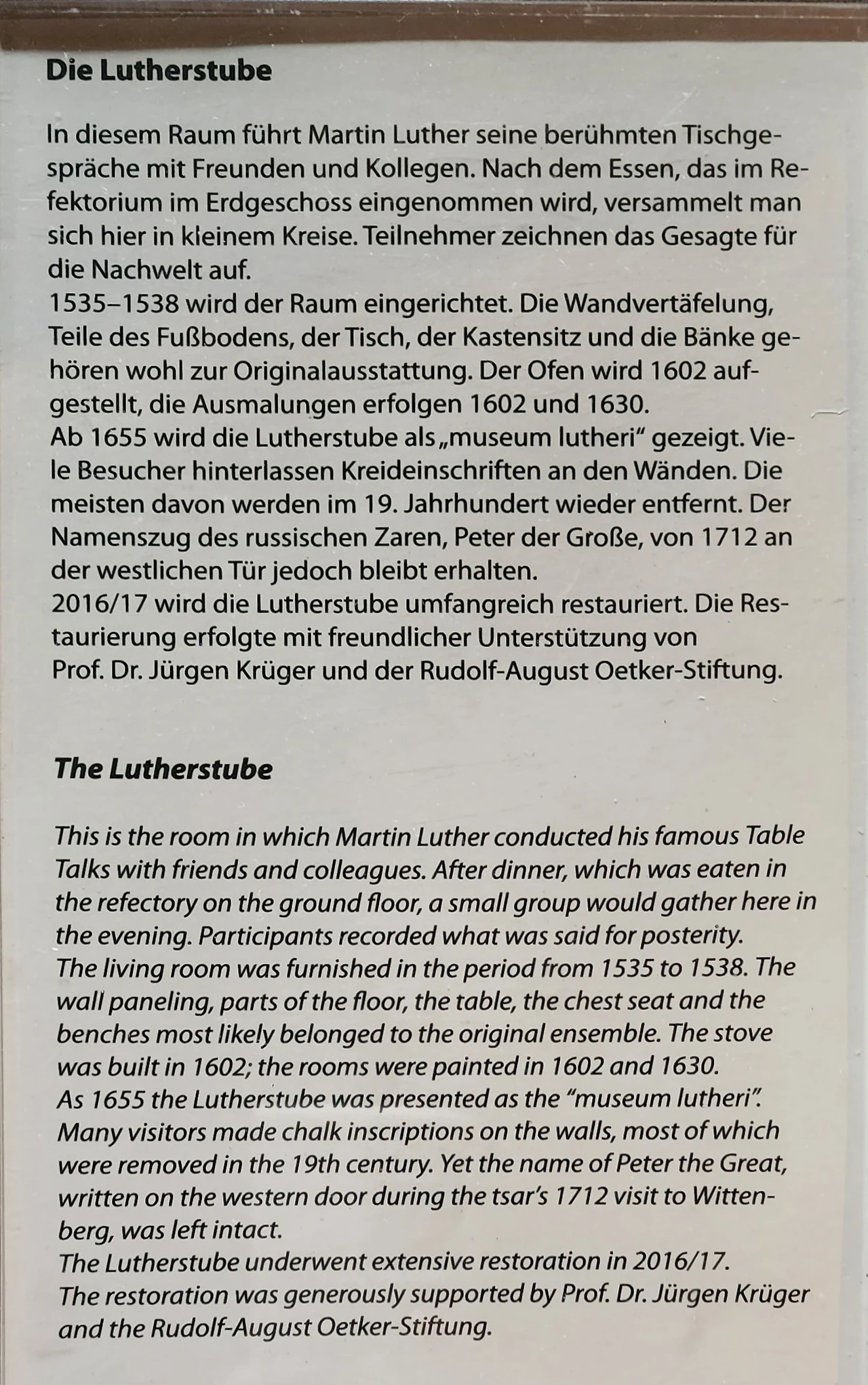 위의 설명을 고려하면 결국 우리가 지금 루터의 방에서 보는 이 책상이 루터가 그 유명한 탁상대화를 이끌어가던 것이라는 이야기가 된다. 그리고 1530년대에 만들어진 이 책상은 500년째 옛 모습 그대로 이 자리에 있는 것이고. 한편 루터의 방은 2016/2017년에 대대적인 복원이 이루어졌다고 하는데, 그것은 크뤼거(Krüger) 교수와 루돌프 아우구스트 오에트커(Rudolf-August Oetker) 재단의 지원이 있었기에 가능했다.