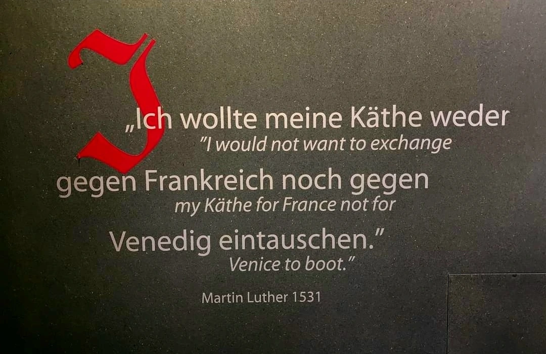"나는 Käthe를 프랑스와도, 또 베네치아와도 바꾸지 않겠다." 아, Käthe는 Katharina의 애칭인데, 여기서 Katharina는 물론 그의 아내 Katharina von Bora를 말한다. 루터가 1531년에 남긴 말인데, 루터가 결혼한 것이 1525년이니 결혼 후 6년의 시간이 흐른 뒤에도 아내에 대한 사랑이 여전했던 것을 잘 보여주는 말...